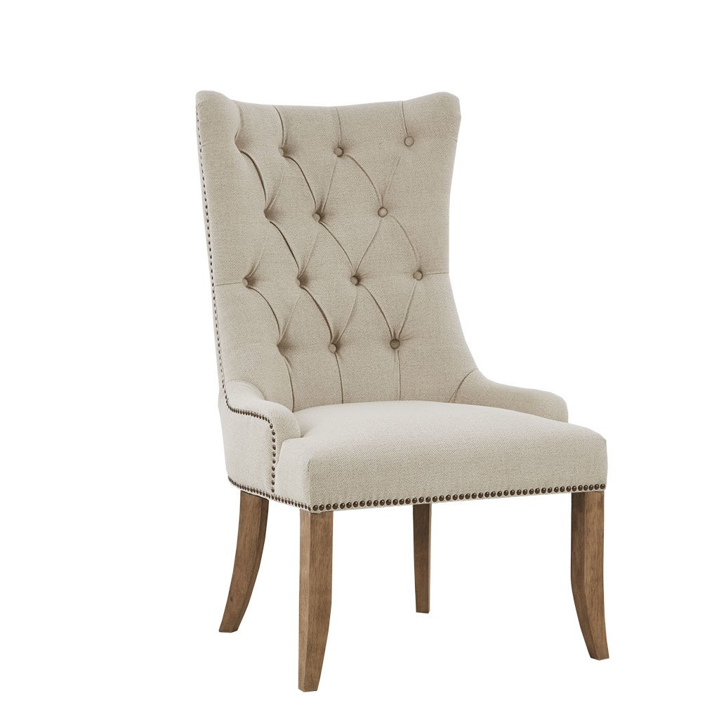 Add a stunning elegant farmhouse update to your home decor with the creme Madison Park Lucas accent chair. This chair can easily add charm to your living room, dining room, or office. This accent chair features a high, button-tufted back and antique bronze nailhead details that creates an elegant look. The natural fabric upholstery is complemented by the wheat finish on the solid wood legs to complete the farmhouse aesthetic. With its charm and sophistication, this accent chair elevates the style of your living or dining room.