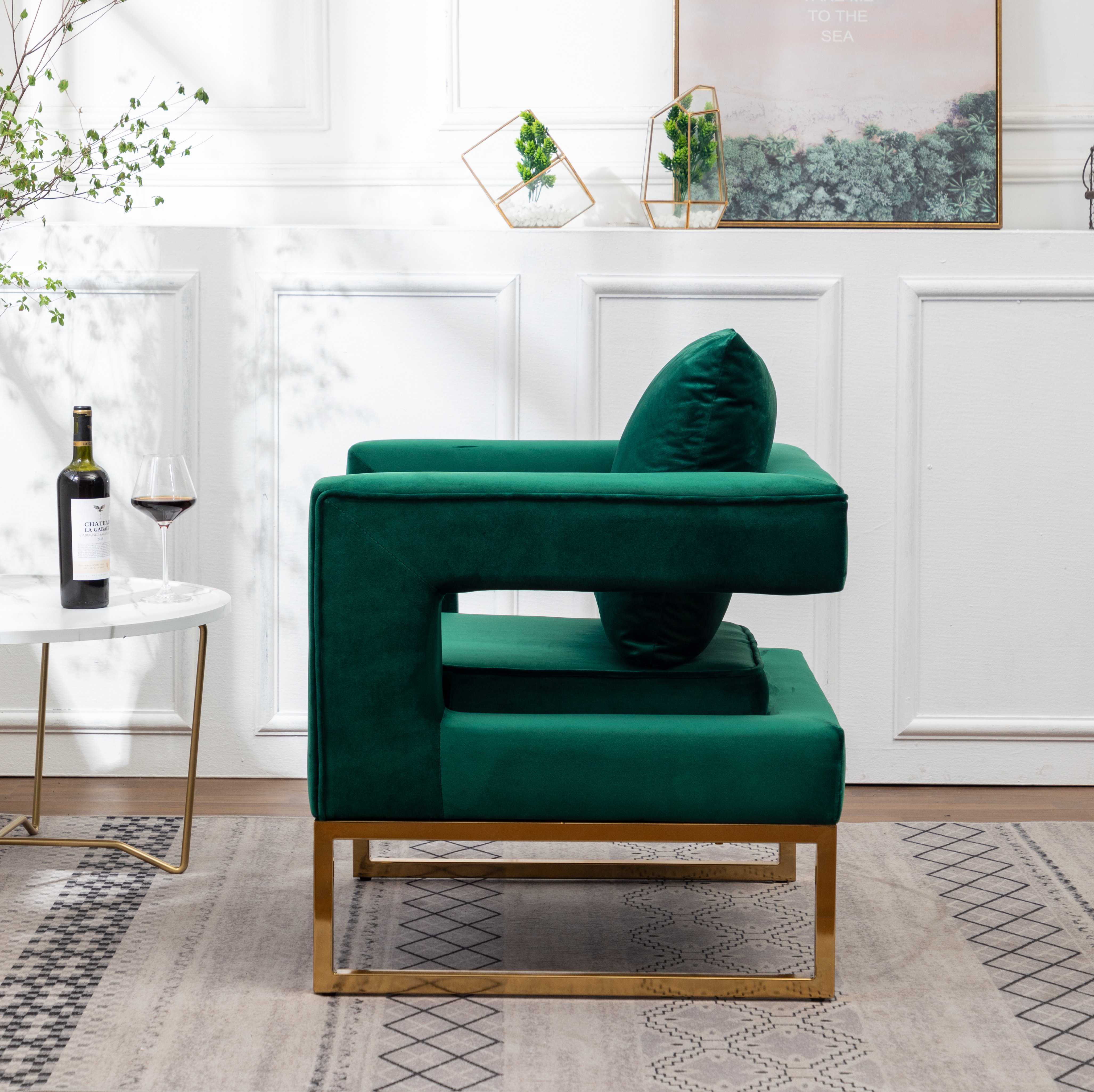 Lenola Contemporary Upholstered Accent Arm Chair, GreenYou'll feel at the height of glamorous sophistication sitting in the Lenola Contemporary Upholstered Accent Arm Chair, even though the design is simple and modern. Gold-colored metal tube frame stands out against the luxe upholstery and gives this seat a strong and sturdy base for long-lasting lounging. The square, cut-out arm's, and pillow back design make this chair luxuriously comfy in a decidedly updated aesthetic for an unexpected addition to your home.