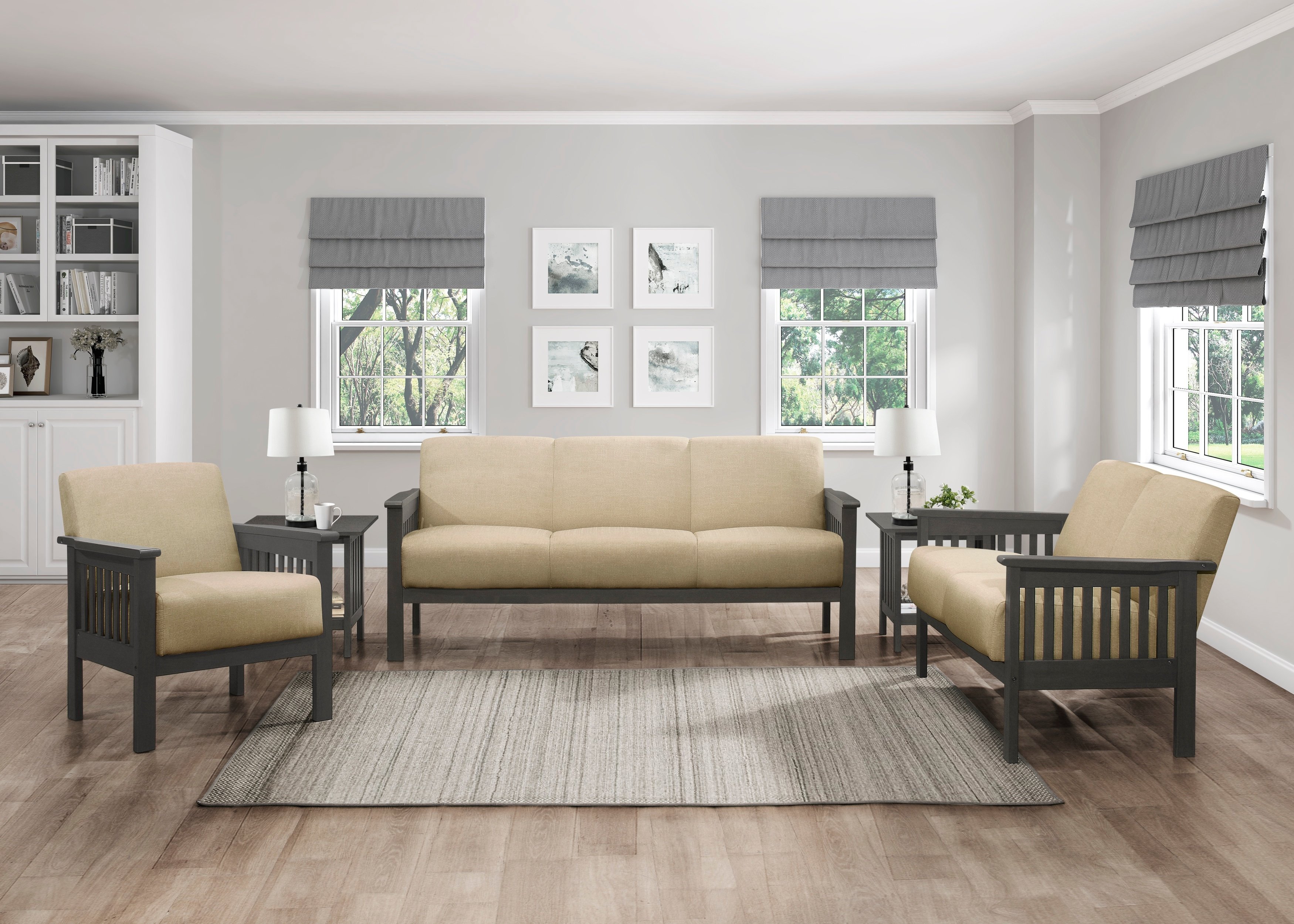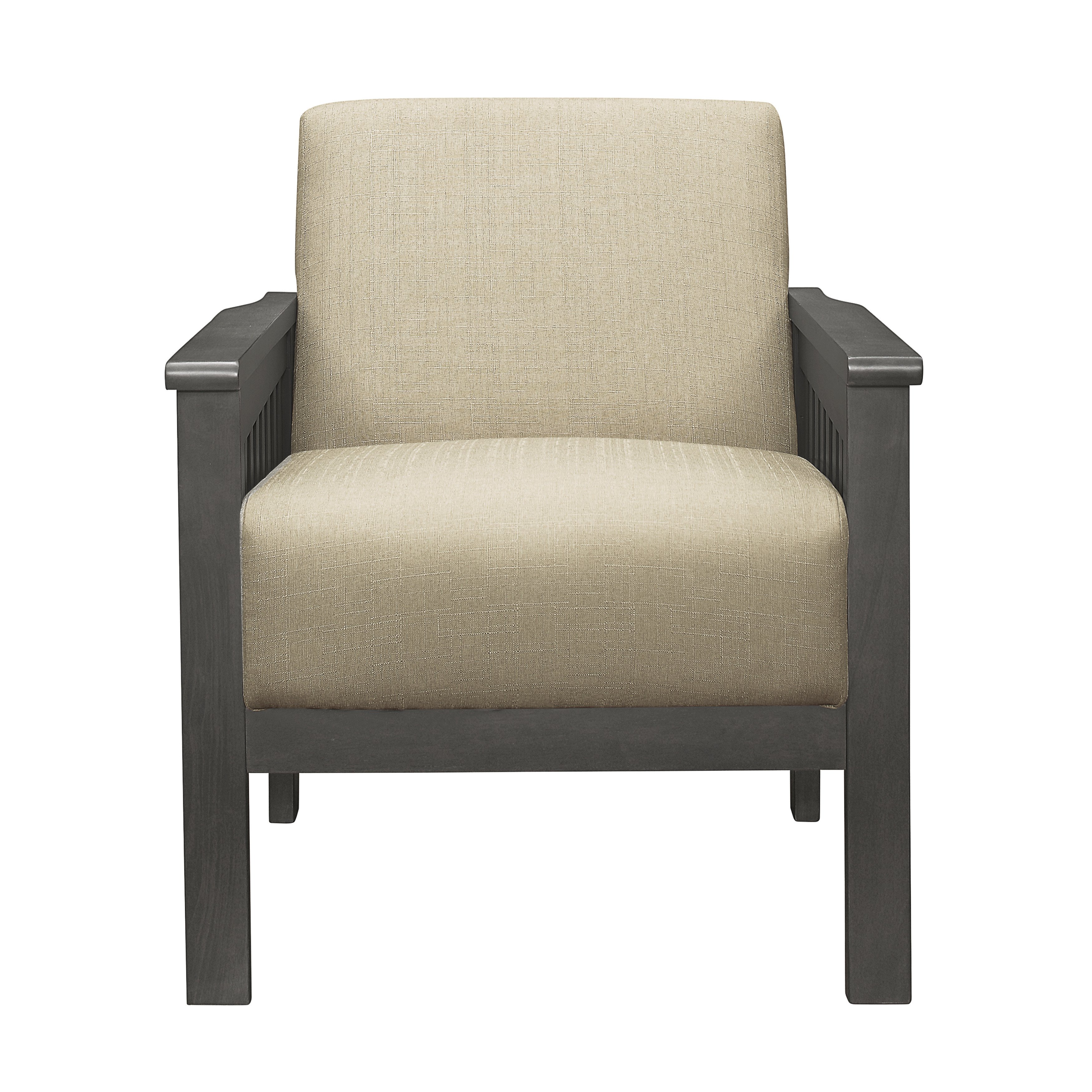 Designed with inspiration from the Arts & Crafts movement, the Lewiston Collection will be a classic addition to your home's décor. The chair's transitionally styled legs and vertical slat-supported wood arms are finished in an antique gray, providing complementing contrast to the brown linen-like fabric covering.PRODUCT DIMENSIONS: Overall Dimension: 27.5" x 31" x 32"HSeat Width: 22"Seat Depth: 21.5"Seat Height: 19.5"Arm height: 24.5"Listing Includes: One Accent Chair Only.Sofa & Loveseat: Not included.Simple Assembly Require.