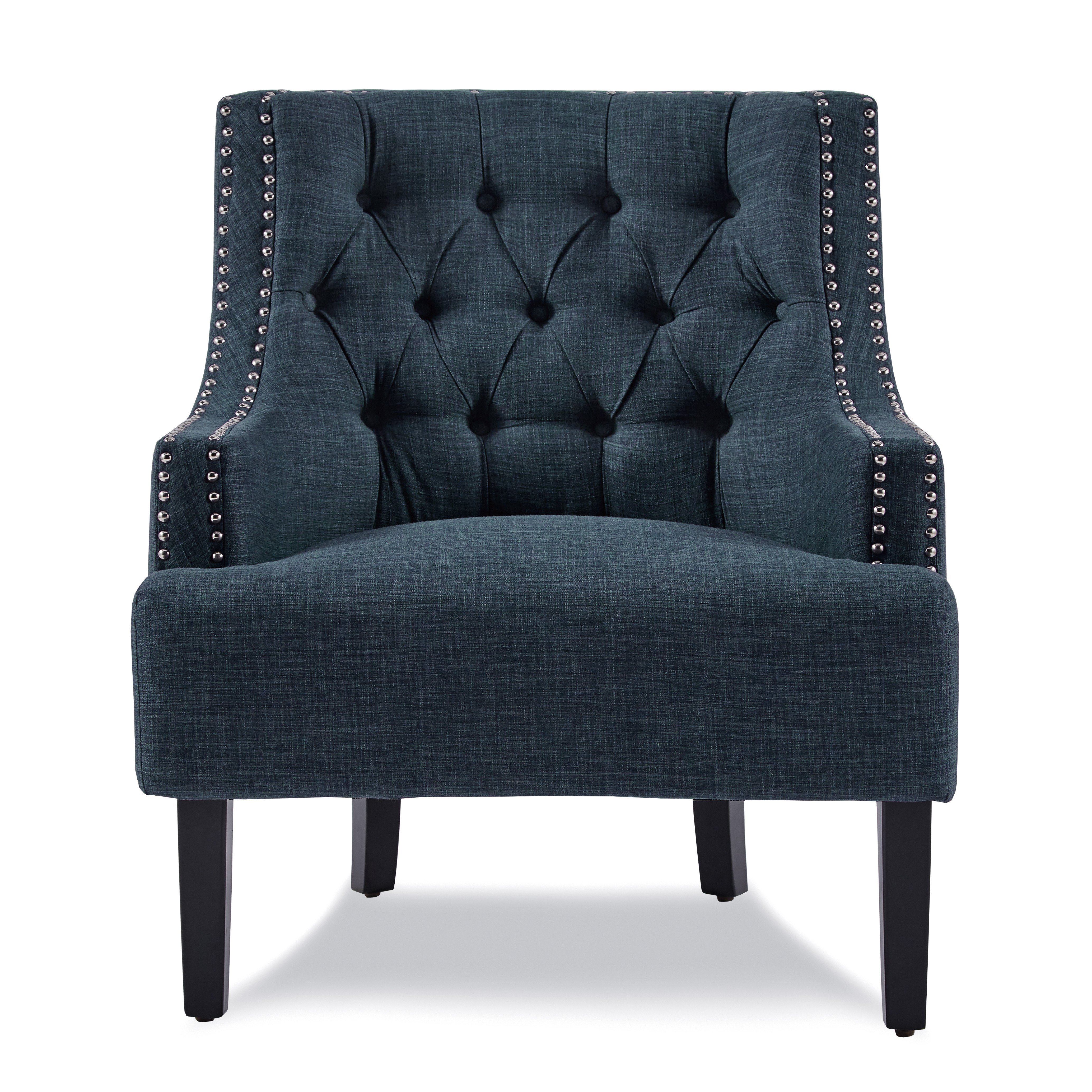 High polish nailhead accents and defines the profile of the Charisma Collection. This modern traditional indigo fabric-covered accent chair provides a stylish, yet functional addition to your home. The chair is offered in 3 additional distinct colors: Teal, taupe and chocolate.PRODUCT DIMENSIONS: Overall Dimension: 28" x 30" x 34"HSeat Width: 22.5"Seat Depth: 22.5"Seat Height: 18"Arm height: 21.5"Listing Includes: One Accent Chair Only.Simple Assembly Require.