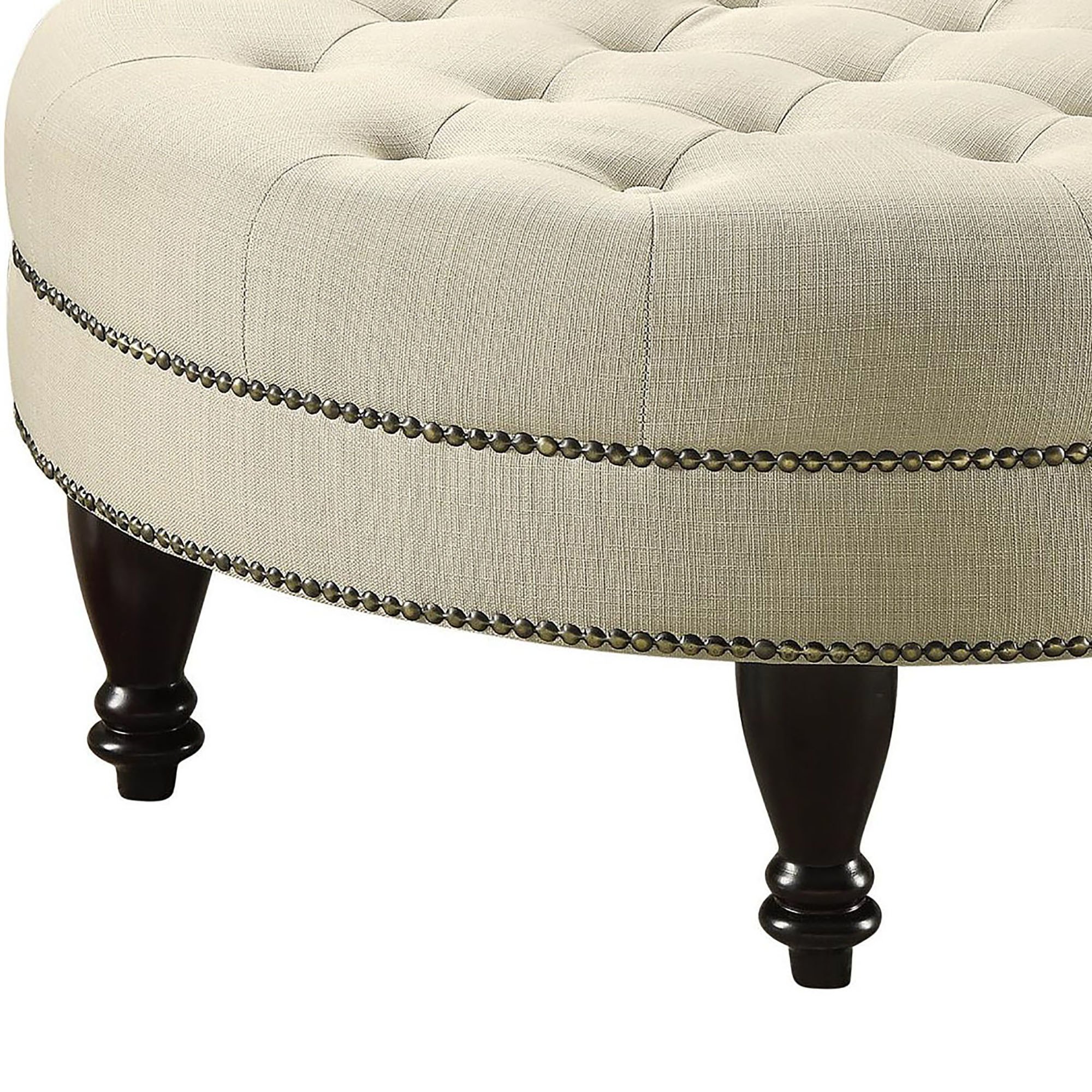 This ottoman is a prime example of traditional fine design with its pleasing round shape, creamy upholstered finish with lavish button tufting and nailhead trim, and its elegantly turned legs in a rich wood finish. It sets a luxurious tone in a traditional bedroom or living room, and also offers itself as a seating solution or a low table for placing down a tray of drinks or food.