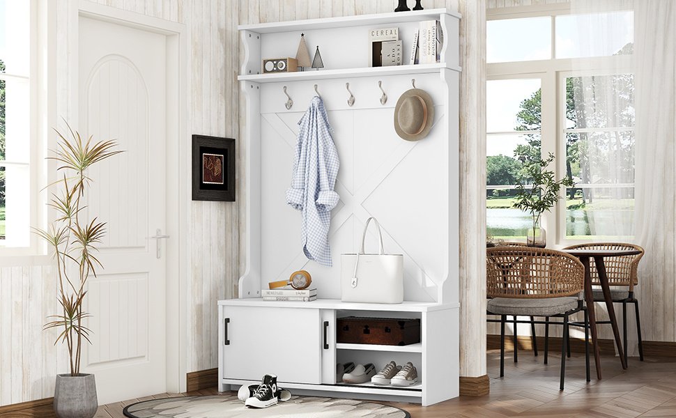 Hall Tree with Top Shelf and Storage Bench, Hallway Shoe Cabinet with Sliding Doors, Coat Rack with 5 Hanging Hooks for Entryways Hallways,White