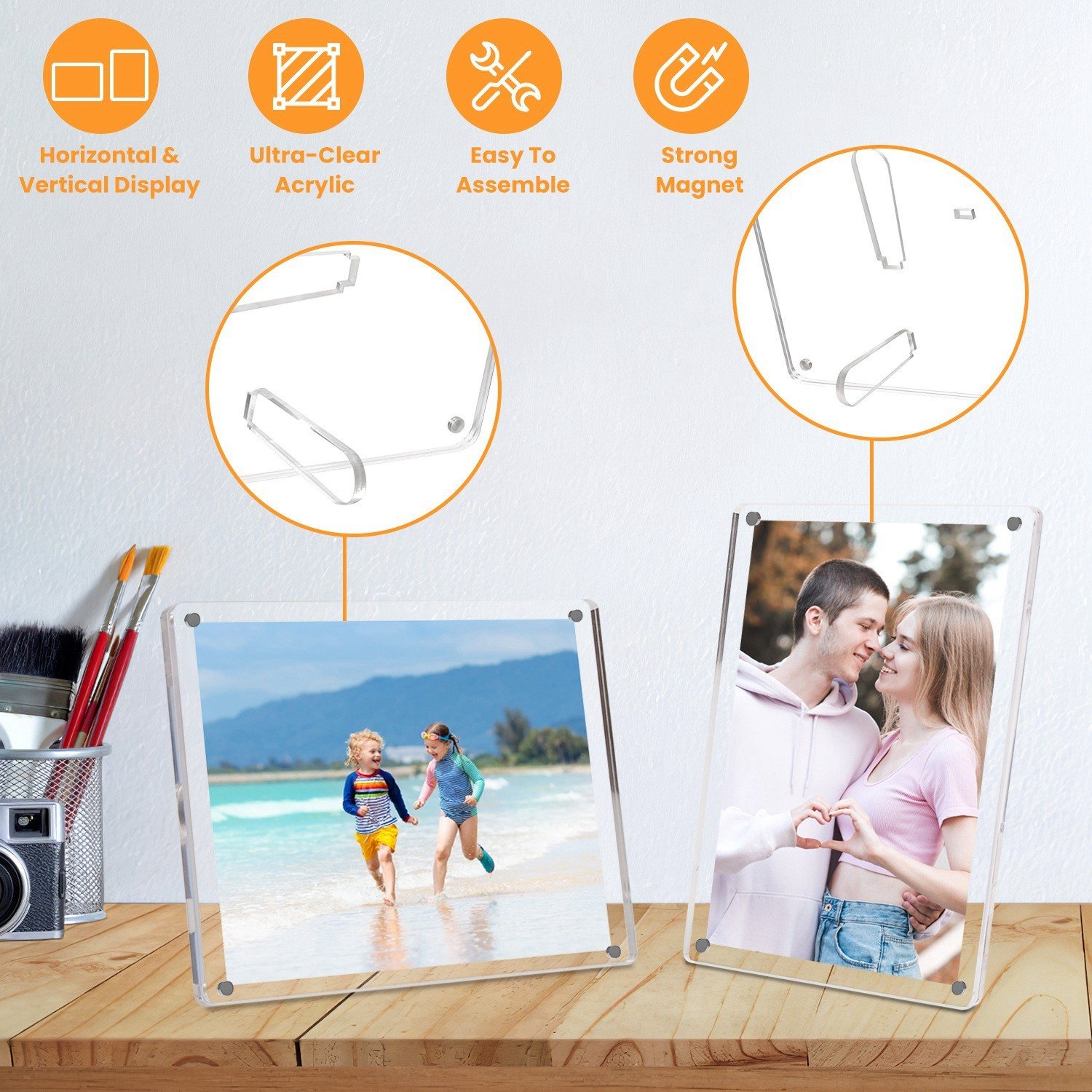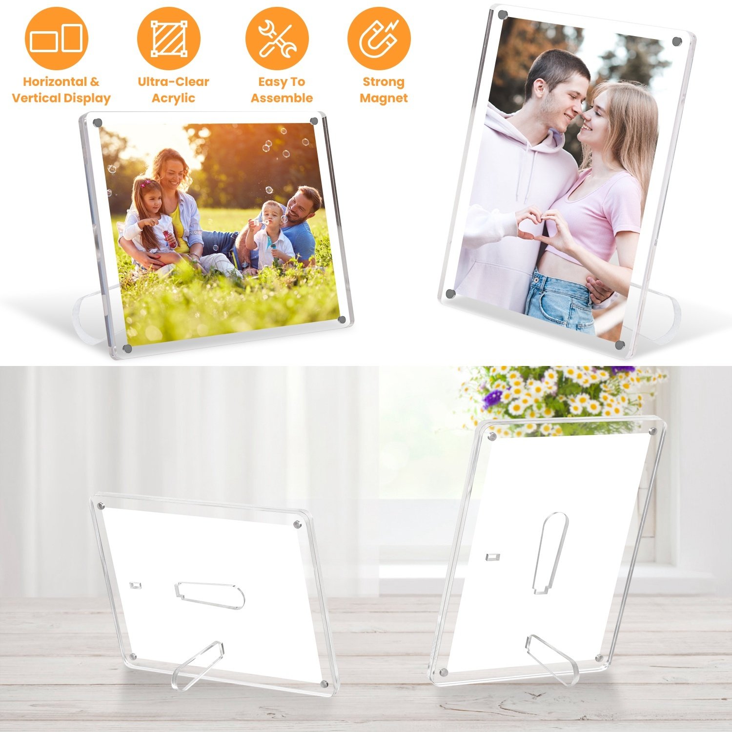 *Easy To Use*:The picture frame consists of 2 acrylic blocks,each block contains 4 powerful magnets,just simple push to separate or align to combine them. Unlike other frames needed screws or buckles,our frame is definitely easy to assemble and replace photos.