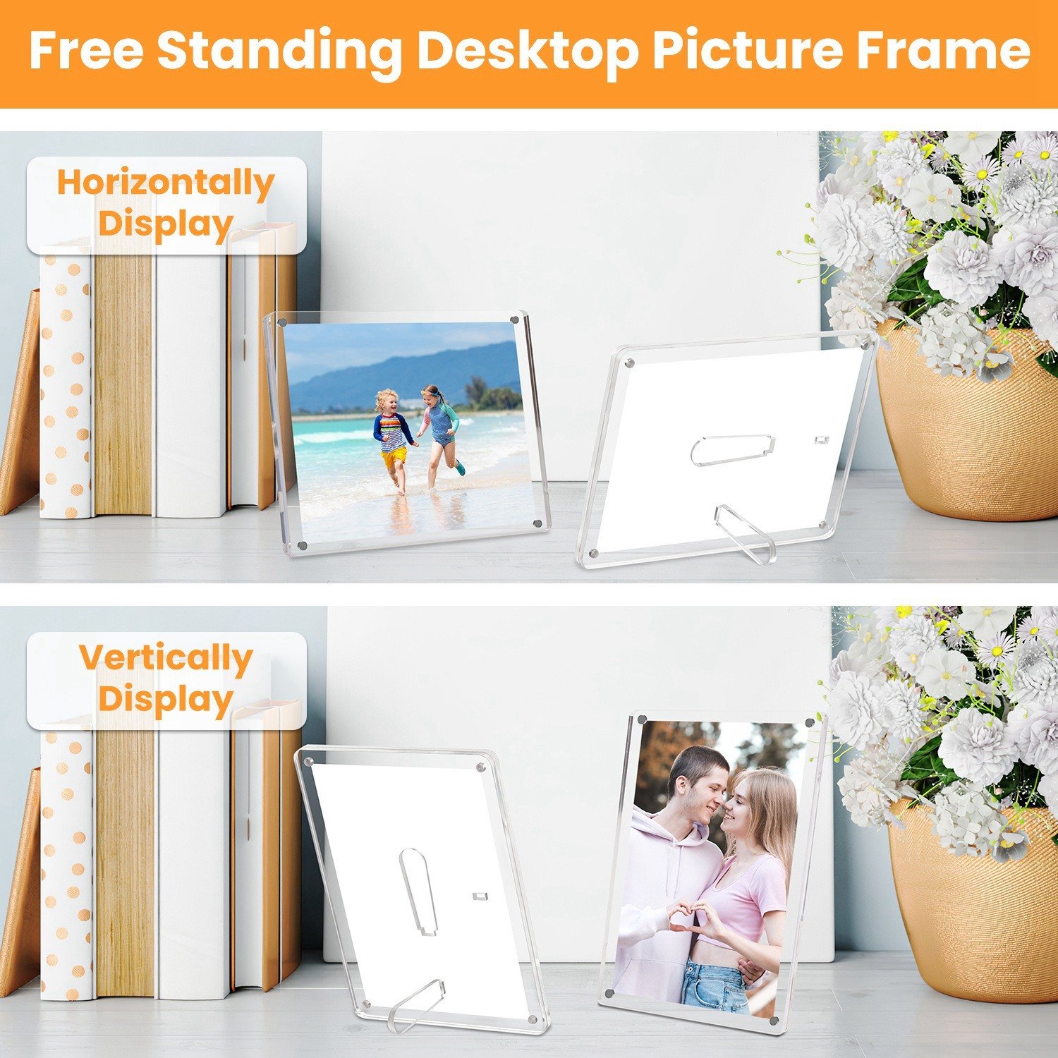 *Free Standing Frames*:The supportive plate is attached behind each picture frame,flexibly allow you to horizontally or vertically display on desktop. Elegant appearance can perfectly match diverse decoration styles.