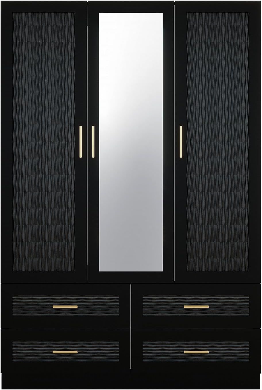 1.Spacious Storage: This modern black wardrobe cloest boasts ample storage with 3 doors, 4 drawers, hanging rod, and a large mirrors. Its sleek, rectangular design and spacious interior provide plenty of room for your clothes, accessories, and more.