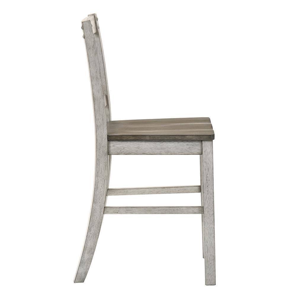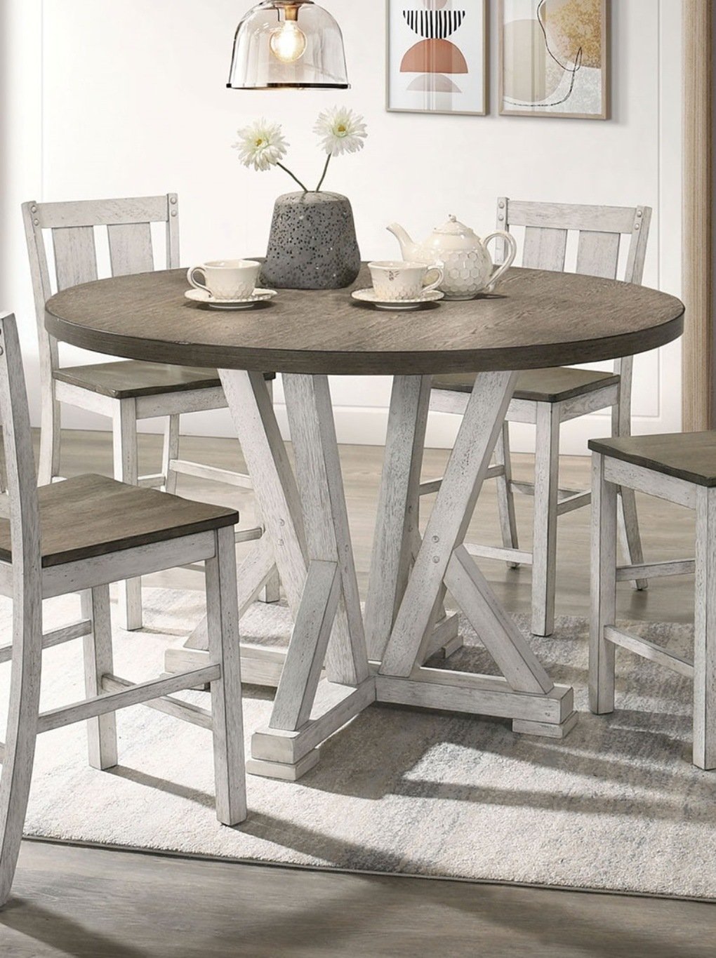 Description - Want a lovely way to start every morning? How about a cozy breakfast on this rustic dinette? The two-tone finish is the star in this ensemble--the table top and seats in warm ash brown color contrasts dramatically with the antique white body frames. They share the same knotty oak veneer that shows multiple dark lines and wood grain, giving the set its natural warmth. Holding up the table top are four bars supported with four legs in a unique pedestal configuration. The diagonal lines create a silhouette that's strictly farmhouse in style..Dimensions -Counter HT. Dining Table - 48"DIA X 36"HDining Chairs - 17 1/2"W X 21"D X 39 3/4"H (SEAT HT: 23 1/4", SEAT DP: 17 3/4")Listing Includes - 5pc Counter Height Dining Set (1x Table And 4x Side Chairs) Only.Features :-RusticAntique White/Ash BrownSolid Wood, Wood Veneer, OthersFarmhouse DesignTwo-toneKnotty Oak VeneerPedestal Base w/ Support LegsWooden Seat