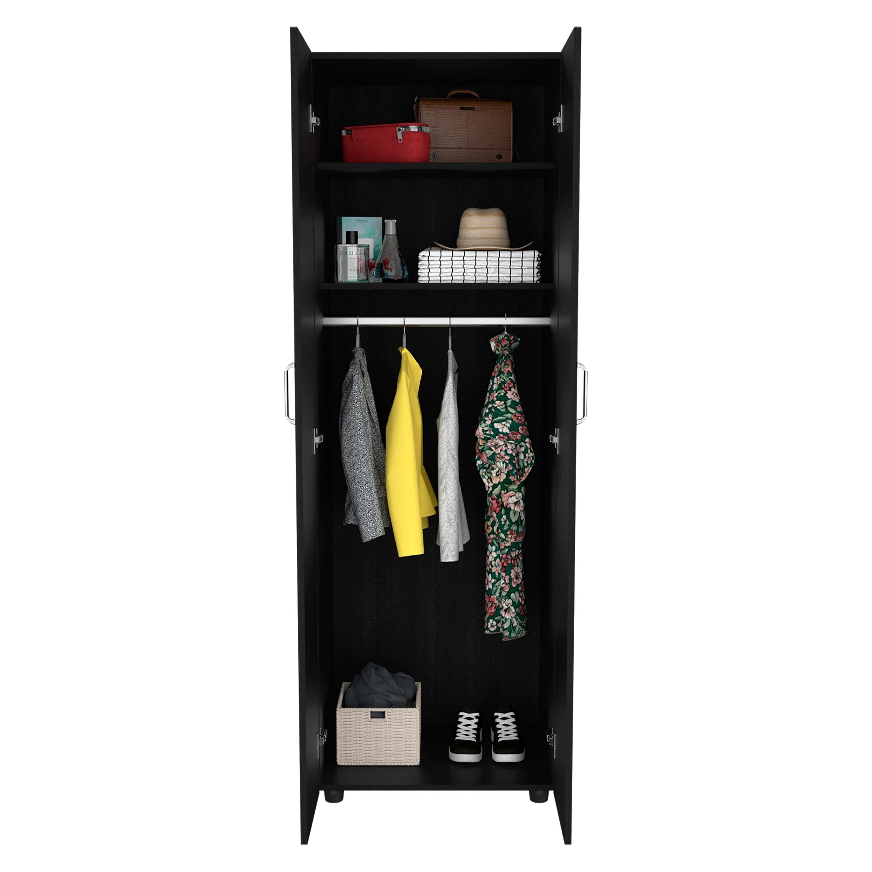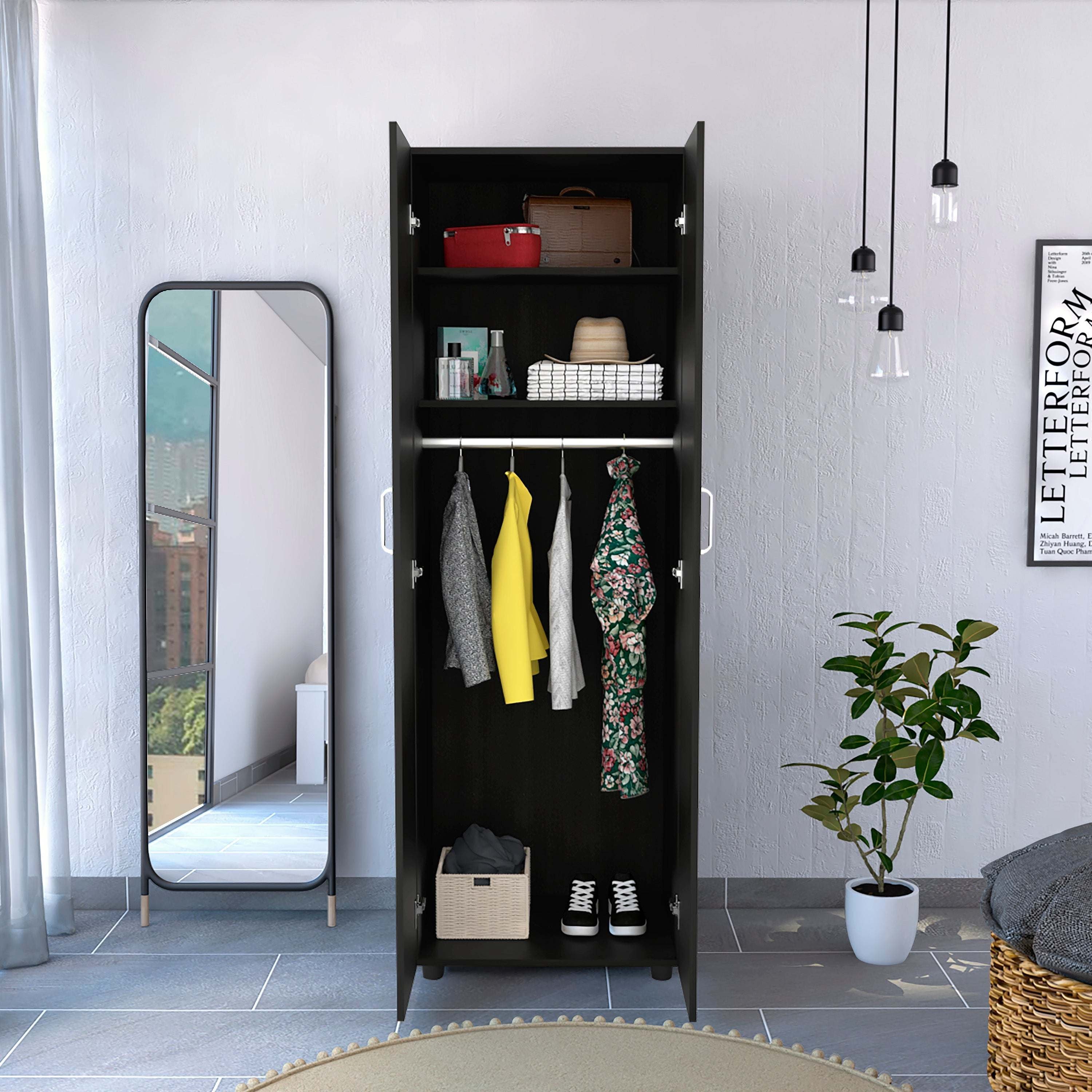 Maximize your storage without sacrificing space with the Barkley Armoire Closet. Its slim profile makes it ideal for bedrooms or hallways, while the double doors reveal a well-organized interior. Two upper shelves provide ample space for folded items and accessories, and a hanging rod below keeps your wardrobe neatly arranged and wrinkle-free.
