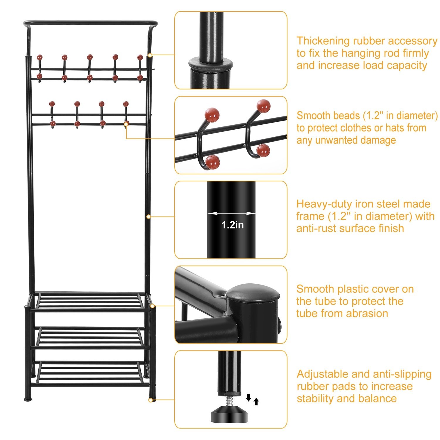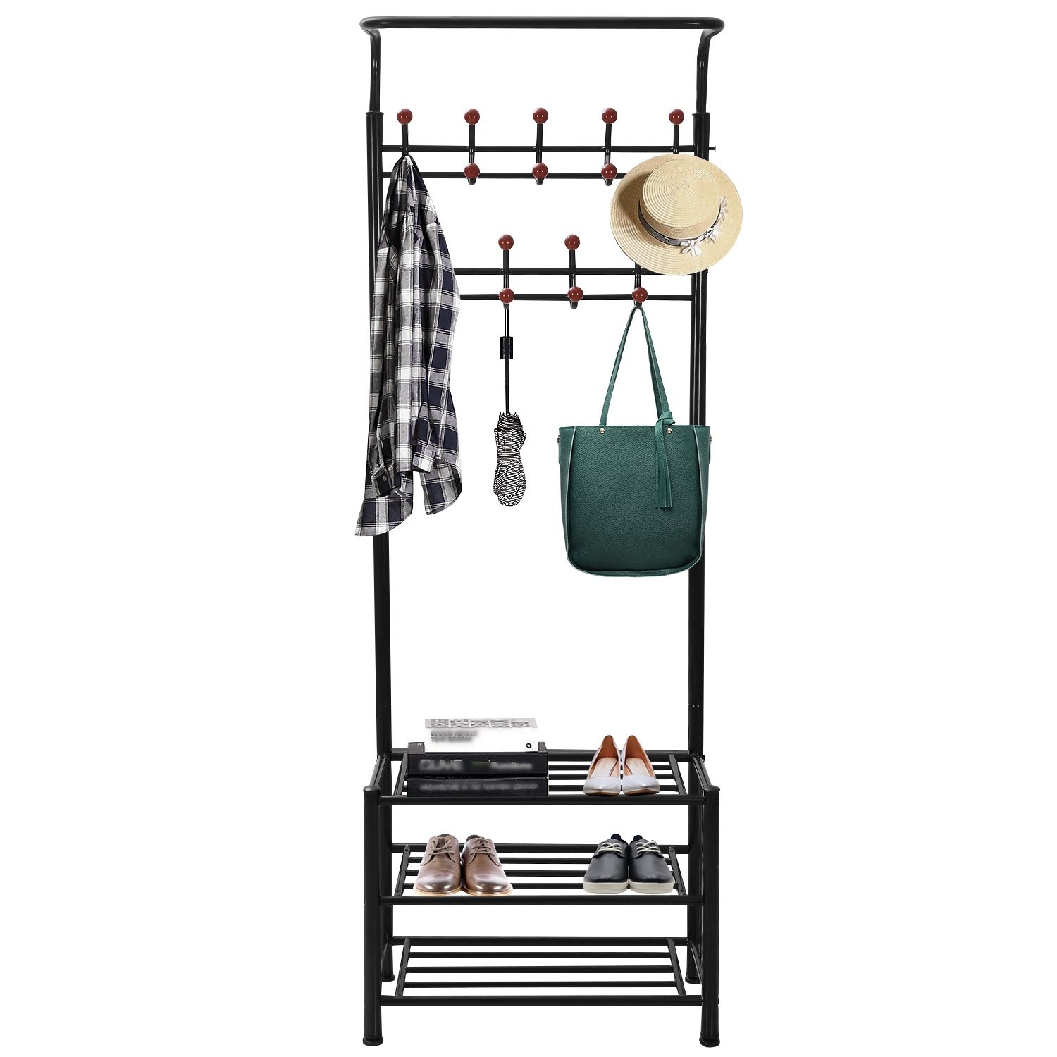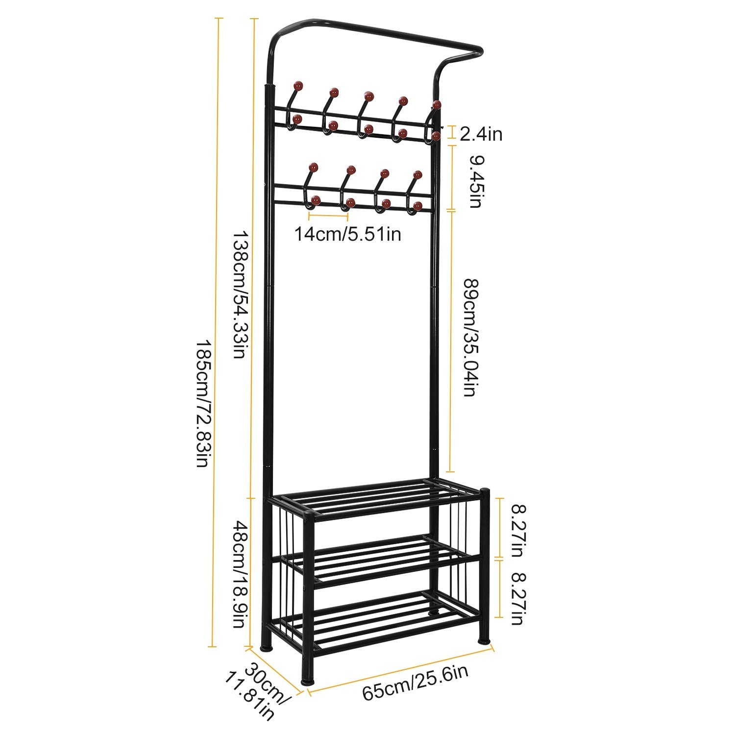 Metal Entryway Coat Shoe Rack Hall Tree w/ 3-Tier Shoe Bench Shoe Storage 18 Hooks Coat Hat Rack