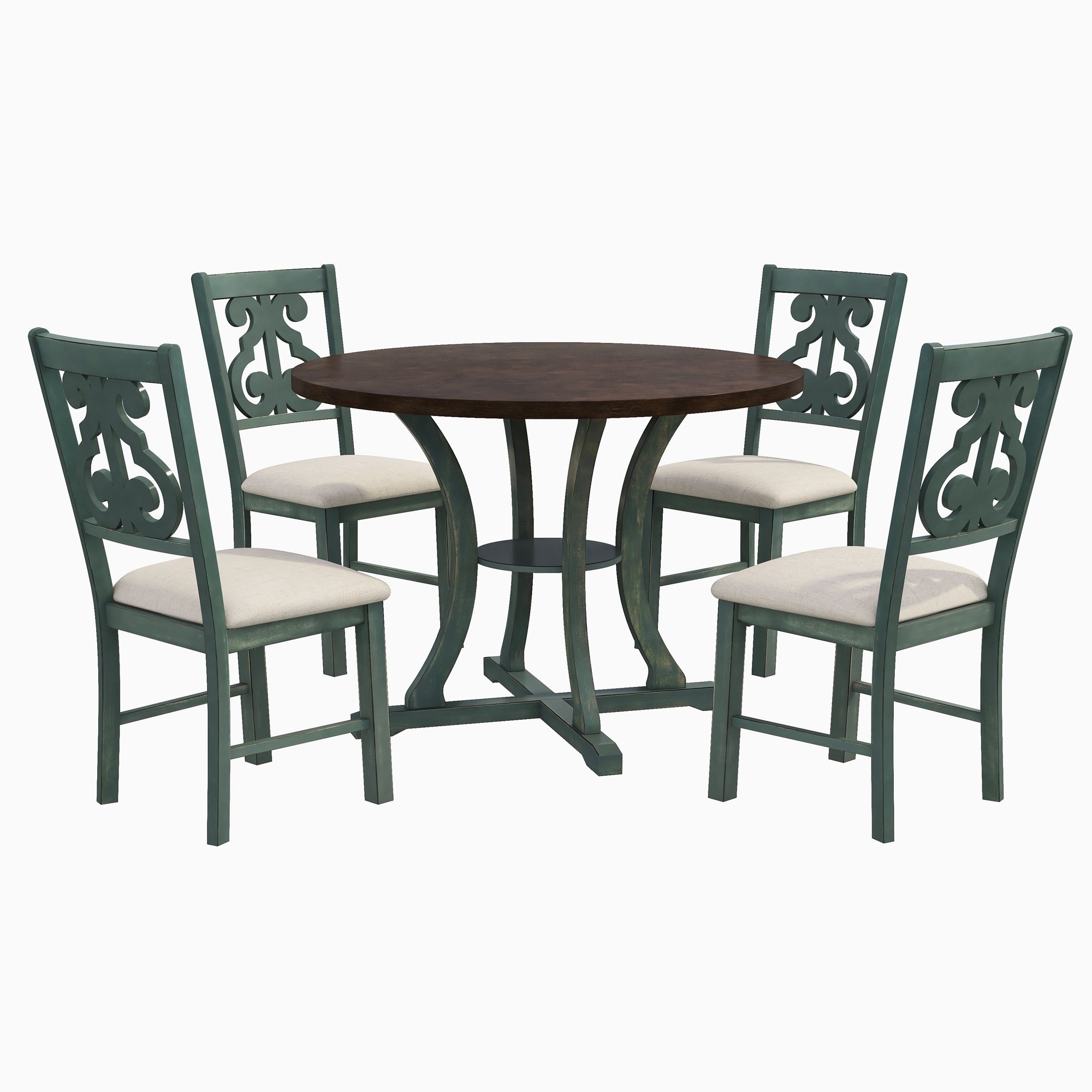 5-Piece Round Dining Table and 4 Fabric Chairs with Special-shaped Table Legs and Storage Shelf