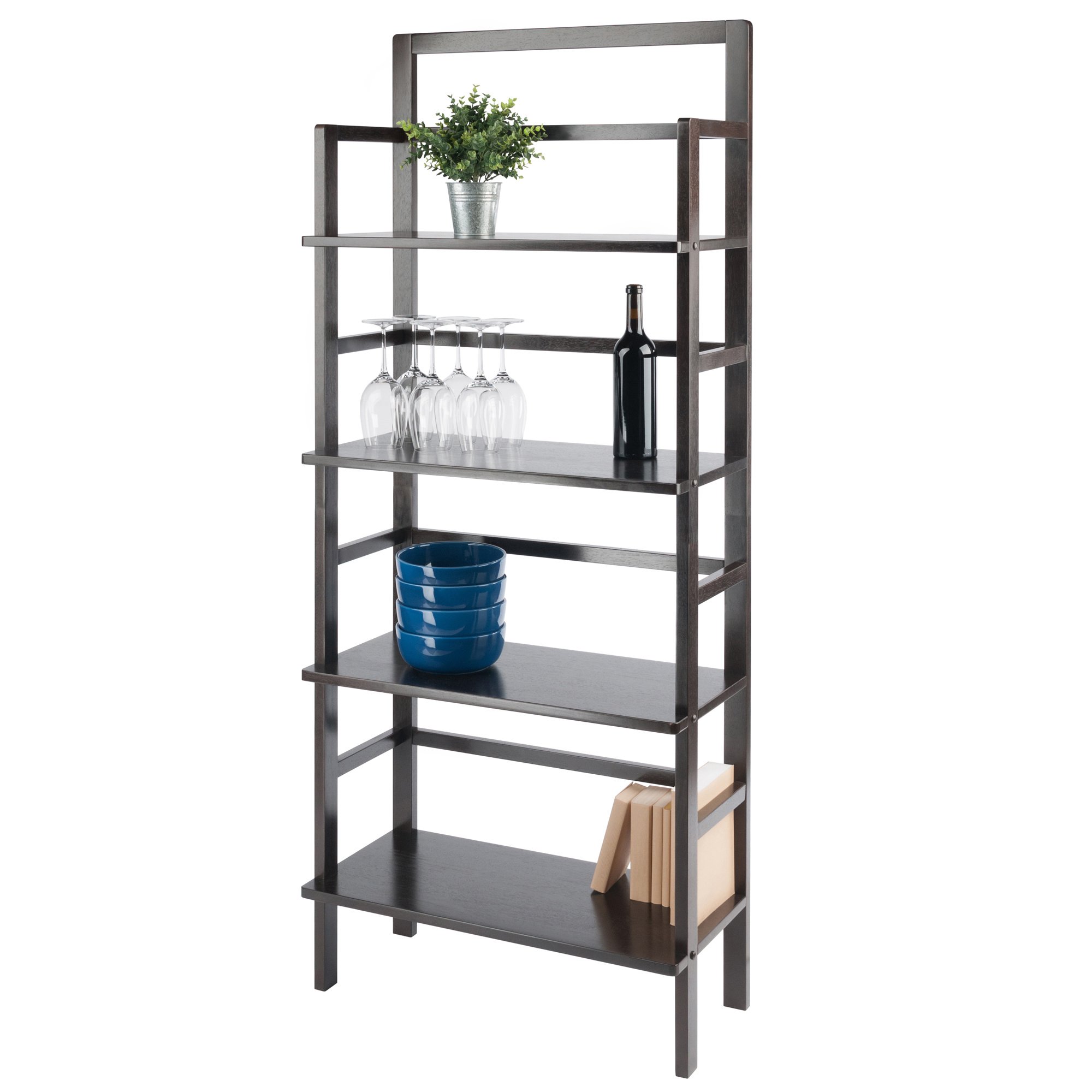 The Winsome Wood Aiden Baker's Rack takes the time-honored  styling of a Tuscan baker's rack and turns it into a contemporary shelving unit made of Solid Wood. Bring it into your open-concept kitchen to hold your favorite cookbooks; everyday dishes; and glasses. Or showcase your best serveware; a few bottles of wine; even a treasured plant on the open shelves. The rack also makes an ideal shelf unit in the living room or bedroom for books; framed photos; or awards. It has four wide shelves with nearly 15" of clearance; plenty of space for taller items. Made of Solid Wood in a rich Coffee finish; this unique storage shelf will suit any decor and will be a most welcome addition to your home.  Shipped in one box with hardware needed for assembly. Assembly required.