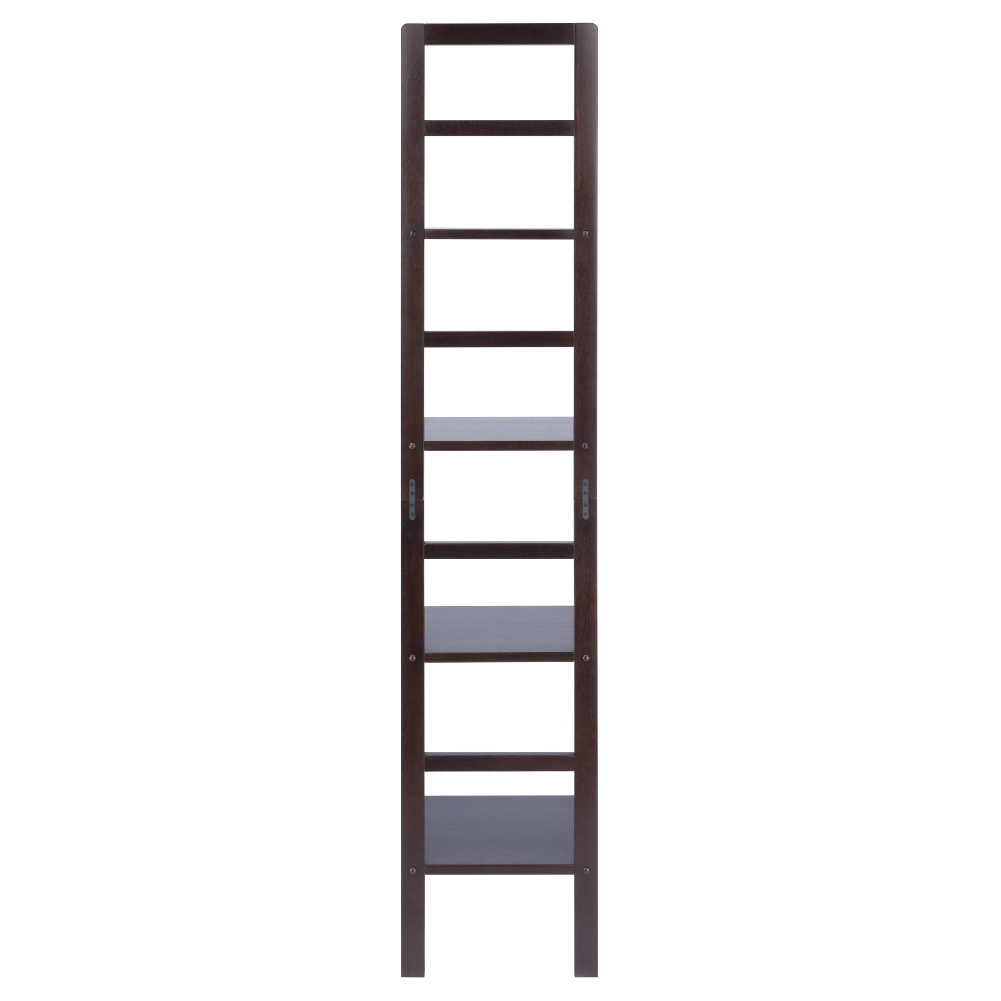 Open kitchen or living room storage unitNarrow design for smaller spacesMade of Solid Wood in Coffee finish4 Shelves with 15" clearanceStatic weight per shelf is 20 lbs.Assembly requiredShips in 1 box