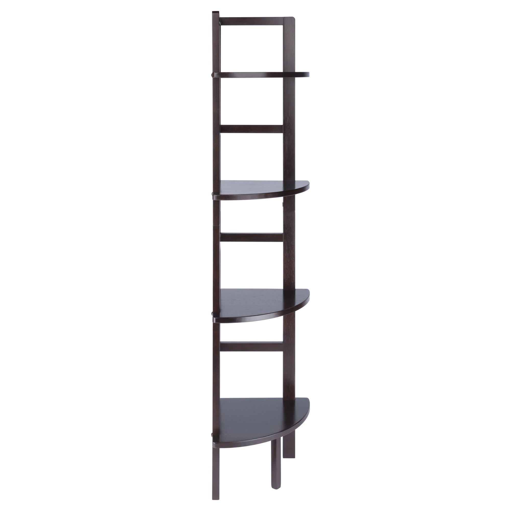 The Aiden Corner Baker's Rack by WInsome combines the styling of an antique Tuscan baker's rack with a contemporary shelving unit that's perfect for unused corner spaces. Bring a touch of open-concept styling to your kitchen where the rack can keep a basket of fruit; mixing bowls; and a few bottles of wine. Or use it in the living room for books and framed photos; with your favorite plant adding flair. The rack also makes an ideal shelf unit in the bathroom for guest towels or decorative items. Made of Solid Wood; it has four shelves with plenty of clearance between shelves and an extra leg support for the bottom shelf. The 90° right angle fits neatly in any corner of your home. FInished in a rich Coffee; this shelf unit will suit any decor. Shipped in one box with hardware needed for assembly.