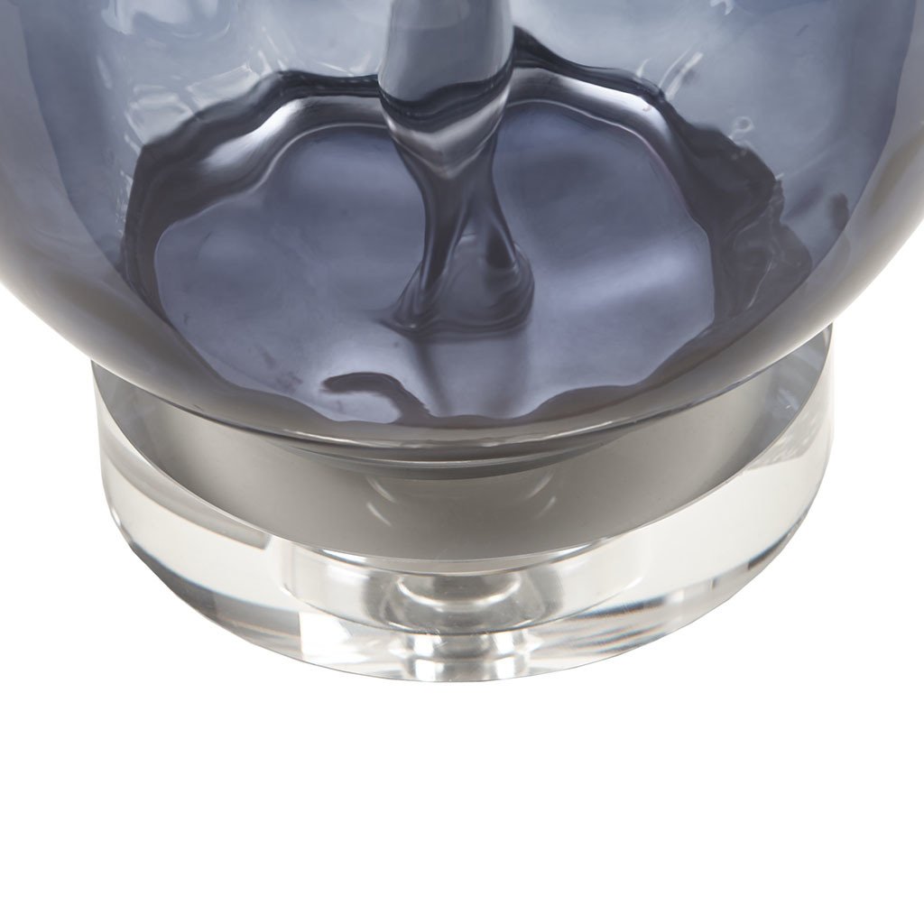 Borel Ombre Glass Table Lamp. Beautifully designed, this glass table lamp flaunts a blue hue that adds a soft touch of color to your room. The cream drum-shaped lamp shade tastefully accents the base, while softly filtering the light to give off a warm glow. Plug in to a power source using the 72-inch clear cord and illuminate your decor by flipping the on/off switch located on the socket. Eye-catching and unique, this glass table lamp offers a chic update to your living room or bedroom. One spiral CFL light bulb is included. One 60-watt incandescent bulb or one spiral 13-watt CFL light bulb is needed.