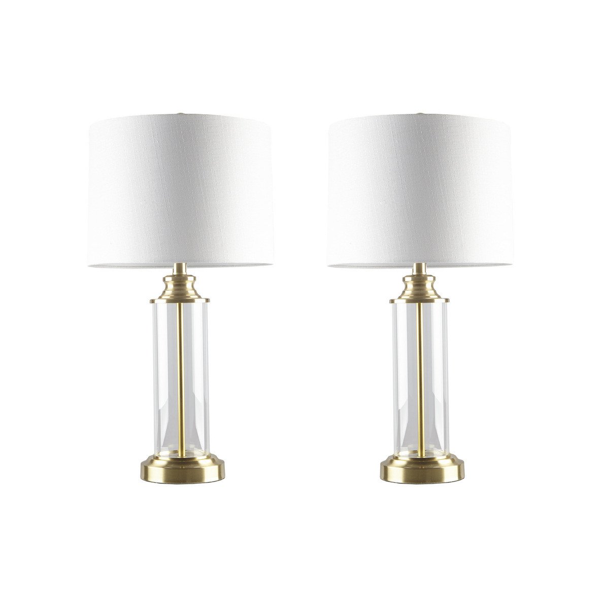 Update your living room or bedroom with the sleek style of the Clarity Glass Cylinder Table Lamp set of 2. The base is made from metal and glass with a gold finish, for an elegant touch. An off white drum-shaped shade softly filters the light, while also beautifully complementing the striking look. Providing plenty of length a 72-inch clear cord and an on/off switch on the socket, this table lamp is easy to incorporate into your existing space and perfect for accenting any transitional home decor. One Type A light bulb is needed. Comes with a 2-year warranty.