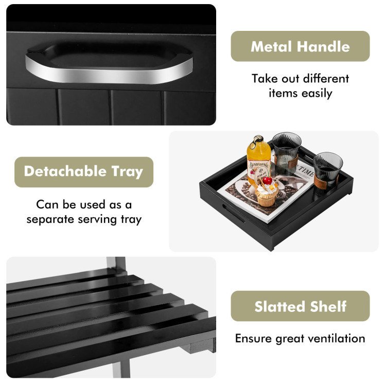 ● Ample Storage Space: Featuring a wide countertop, this cart offers spacious food preparation surface for you. 3 large drawers keep some utensils, silverware and glassware in an enclosed space to remain secure. And it is designed with a tray and 2-tier open shelves to help you make the kitchen organized.