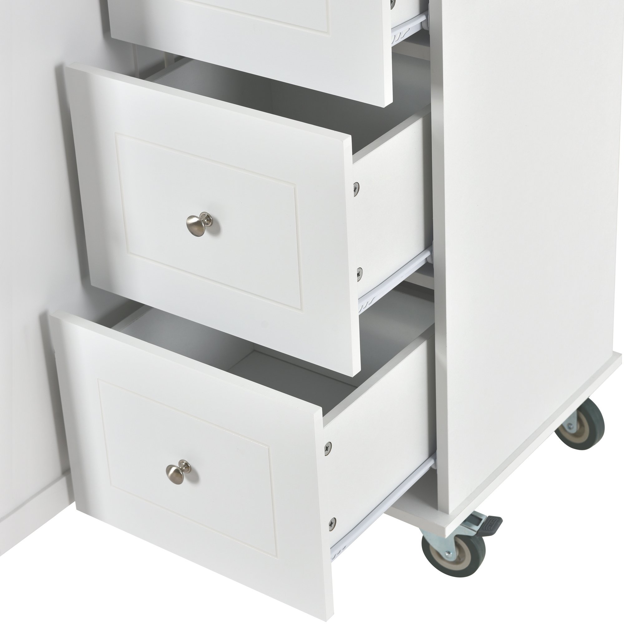 The Rolling Mobile Kitchen Island with Drop Leaf is the perfect addition to any kitchen. With its multifunctional design, solid wood top, locking wheels, storage cabinet, and drop leaf breakfast bar, it offers both convenience and style. The island boasts a spacious and durable solid wood top that is perfect for preparing food and cooking meals. The two locking wheels ensure stability and prevent the island from moving while in use. The island also boasts an ample storage cabinet with adjustable shelves, three storage drawers, a spice rack, and a towel rack, providing plenty of space for all your kitchen essentials. The drop leaf breakfast bar is the perfect spot to enjoy a quick meal or snack and can be easily folded down when not in use. Additionally, the island's sleek and stylish design will complement any kitchen decor. Invest in the Rolling Mobile Kitchen Island with Drop Leaf today and transform your kitchen into a functional and beautiful space.