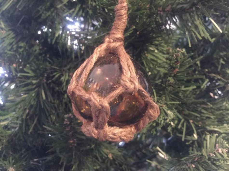 This Amber Japanese Glass Ball with White Netting Christmas Ornament 2" is a perfect piece of beach wall art. Gorgeous decor on your Christmas tree, enjoy the charming inner warmth of this buoy float as lights play through the glass ball. Perfectly contrasting the glass float is the authentic fishing rope netting which holds the float in place. This float ornament decoration will light up any tree and adds the final nautical touch your Christmas needs. This charming float ornament can be easily hung onto any Christmas Tree.