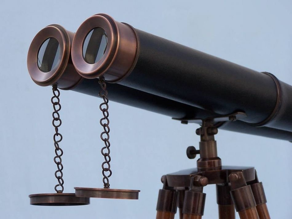 The polished bronzed double scope hand wrapped in leather, enables its user to use both eyes to focus an object while keeping the binoculars steady with the stand. These binoculars are capable of reaching up to 12x magnification and can be focused using a knurled focusing ring in the center of the binoculars.