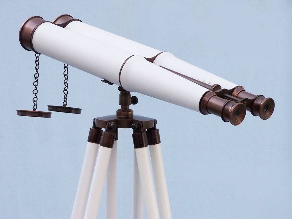The Hampton Nautical Floor Standing Admiral's Bronzed With White Leather Binoculars 62" is a modern nautical decor masterpiece. Complete with a rare and expensive shisham wood white finished tripod stand, this is considered our top of the line binocular offering. This is a fully functional double barrel binocular, and looks great resting on your living room floor or patio deck. The picture of this amazing marvel does not do it justice.
