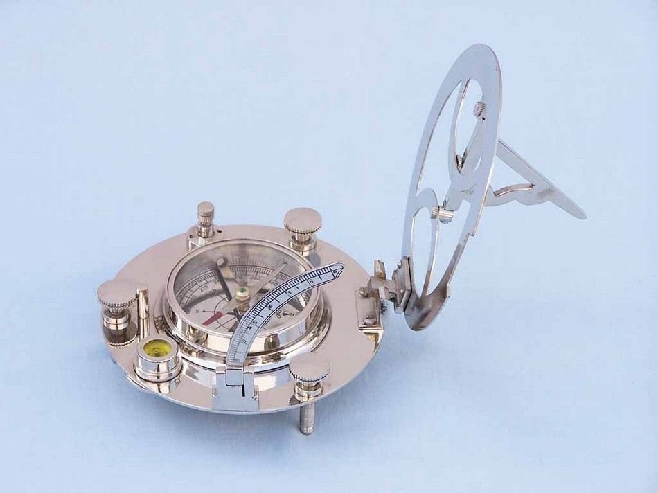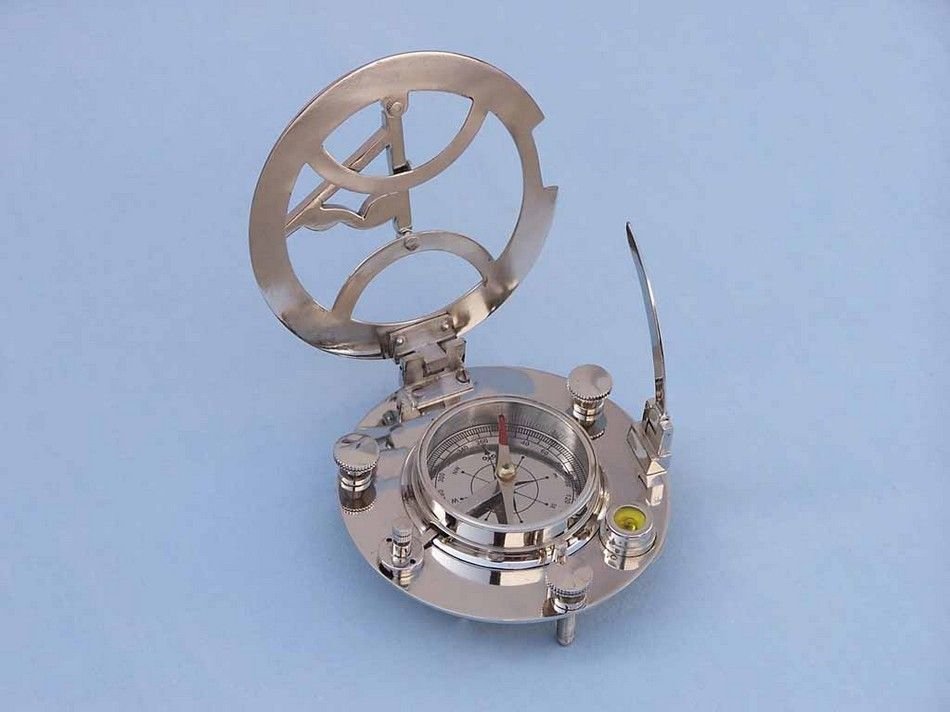 This is a beautiful Hampton Nautical 6-inch Antique Copper Round Sundial Compass with Rosewood Box. The top of the sundial is hinged and a curved scale is used to set your local latitude angle. The magnetic compass allows the sundial to be oriented North. The compass features a needle lift mechanism to protect the compass' jeweled bearing when being transported. There are three adjustable legs that are used to precisely level the sundial. The sun's shadow cast by the sundial's vane marks the local time.