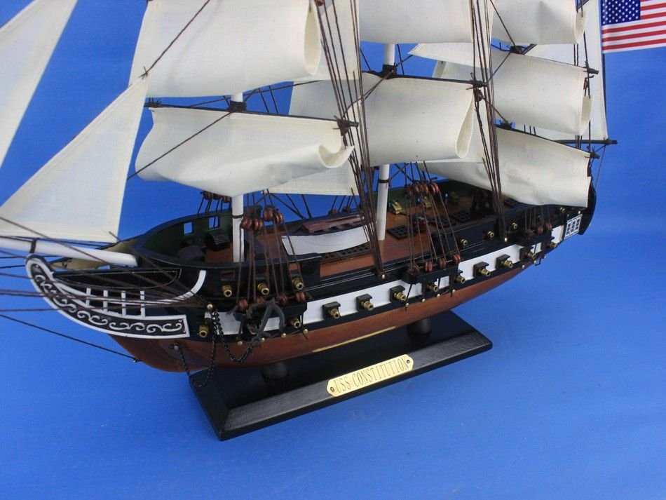 • Wooden display base prominently displays the nameplate: USS Constitution