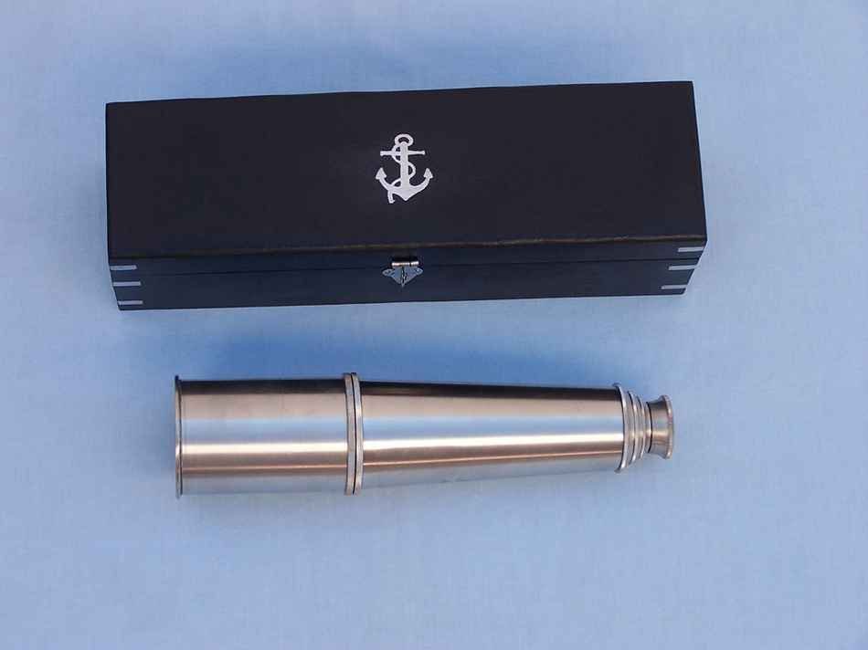 The Deluxe Class Brushed Nickel Spyglass with Black Rosewood Box 36" is the top of the line hand held telescope and will fit splendidly into your nautical home. The spy glass measures 36" when its five nickel tubes are fully extended. The spy glass is 9" when collapsed. Simply adjust the telescope tube length to bring image into clear focus.