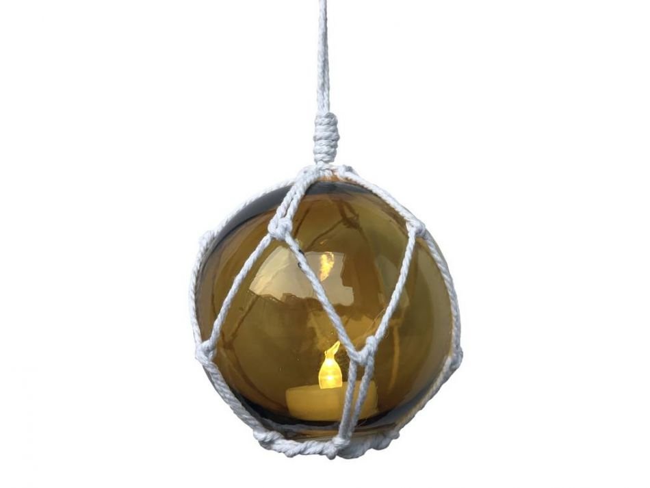 This “LED Lighted Amber Japanese Glass Ball Fishing Float with White Netting Decoration 3”" is a perfect beach wall art decoration. Gorgeous whether in your home or office, indoor or out, enjoy the charming inner warmth of this glass float as the flameless LED tea light inside plays throughout the amber glass ball.  Perfectly contrasting the glass float is the authentic fishing rope netting which holds the float in place. Mesmerizing and enchanting, enjoy the historic wonder and brilliant style of this LED lighted nautical glass float each and every day.