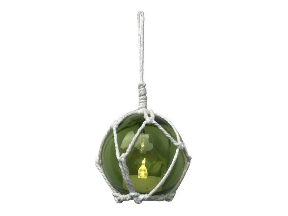 This “LED Lighted Amber Japanese Glass Ball Fishing Float with White Netting Christmas Tree Ornament 3" is a perfect tree ornament to any nautical or beach themed Christmas tree.  Enjoy the charming inner warmth of this nautical glass float as the flameless LED tea light inside plays throughout the amber glass ball.  Perfectly contrasting the glass float is the authentic fishing rope netting which holds the float in place. Mesmerizing and enchanting, enjoy the historic wonder and brilliant style of this LED lighted nautical glass float ornament on your Christmas tree.