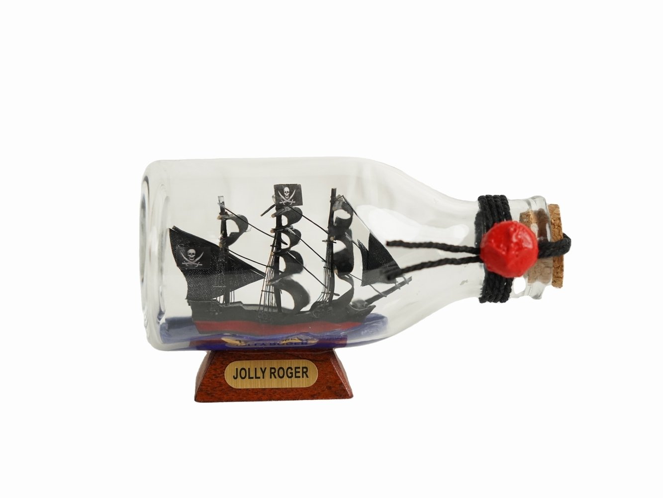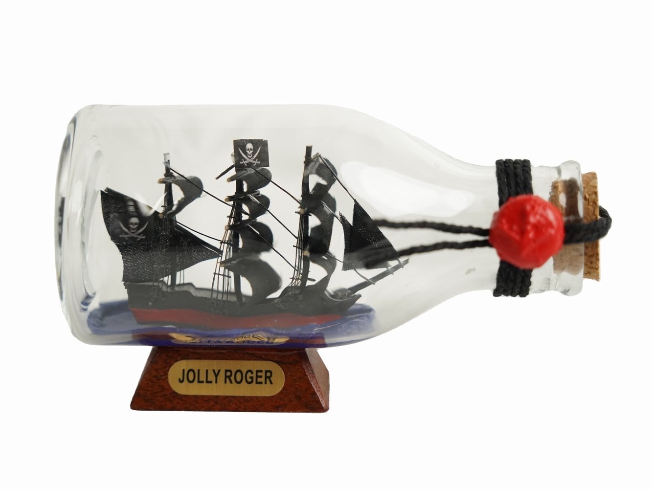 Set sail and take on the high seas with this beautiful replica of Captain Hook's Jolly Roger pirate ship. This item will shine in any room placed in the home or office. This Ship-in-a-bottle is made by the highest quality of wood and carefully placed in a glass bottle. This ship will sit perfectly on any shelf, desk or table and is perfect for those who enjoy the nautical or pirate lifestyle.
