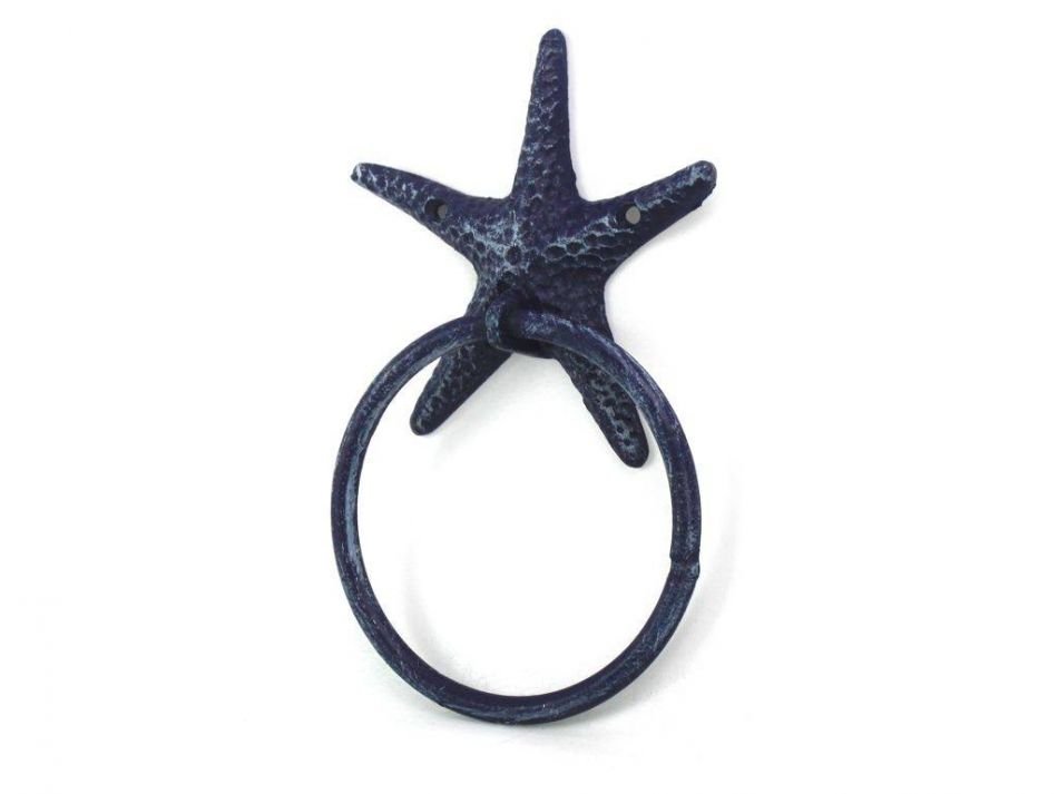 This Rustic Dark Blue Whitewashed Cast Iron Starfish Towel Holder 8.5" is perfect for any nautical inspired bathroom or kitchen. It adds charm to any nautical room, while impressing your guests with their substance and thoughtfulness. Ideal for hanging towels, this durable towel holder 8.5" is crafted from cast iron. Easily mountable, display this decorative holder to show those who visit your home the affinity for the sea-faring lifestyle.