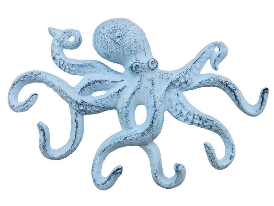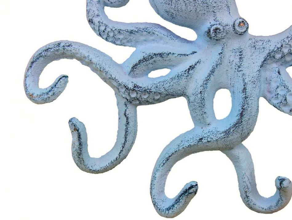 This Rustic Dark Blue Whitewashed Cast Iron Octopus Hook 11" is the perfect addition for any nautical themed home. Handcrafted from cast iron, these dark blue whitewashed hook allow for easy decorative mounting, ideal for hanging accessories. Display this decorative piece to add a nautical theme to any room and show those who visit your home your affinity for the nautical sea-faring lifestyle.