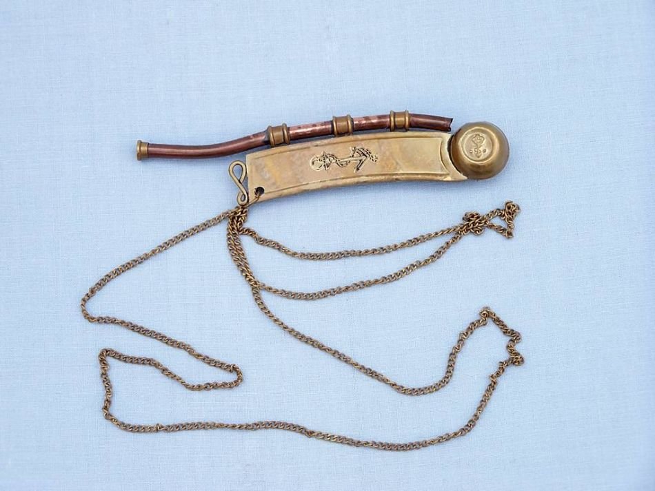 The historic Antique Brass Boatswain (Bosun) Whistle 5", reproduced here in antique brass and gleaming copper, is a classic tool aboard any sailing vessel. Used by the ship’s boatswain to send out calls to the sailors, the high pitched variable whistle carrying above the roar of the ocean, this whistle was vital to rigging the masts, hoisting the sails, dropping the anchor, and every other order. The perfect gift for the nautical enthusiast, collector, or sailor in your life, give this Bosun Whistle with pride.