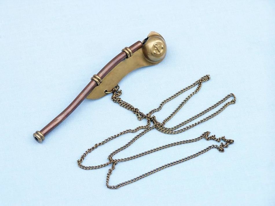 The Hampton Nautical Boatswain's Pipe (pronounced "bosun's") is one of the oldest and most distinctive pieces of nautical equipment. The boatswain's pipe, whistle, or flute, was used in Greece and Rome to keep the stroke of galley slaves. This beautifully detailed antique copper Navy Boatswain's Pipe comes with a quality 39 inch antique copper chain lanyard. With a traditional anchor design inlaid on both sides, this fully functional boatswain's pipe measures 5 inches (12.7 cm) long, and weighs at 1.6 ounces (45 grams) including the chain.
