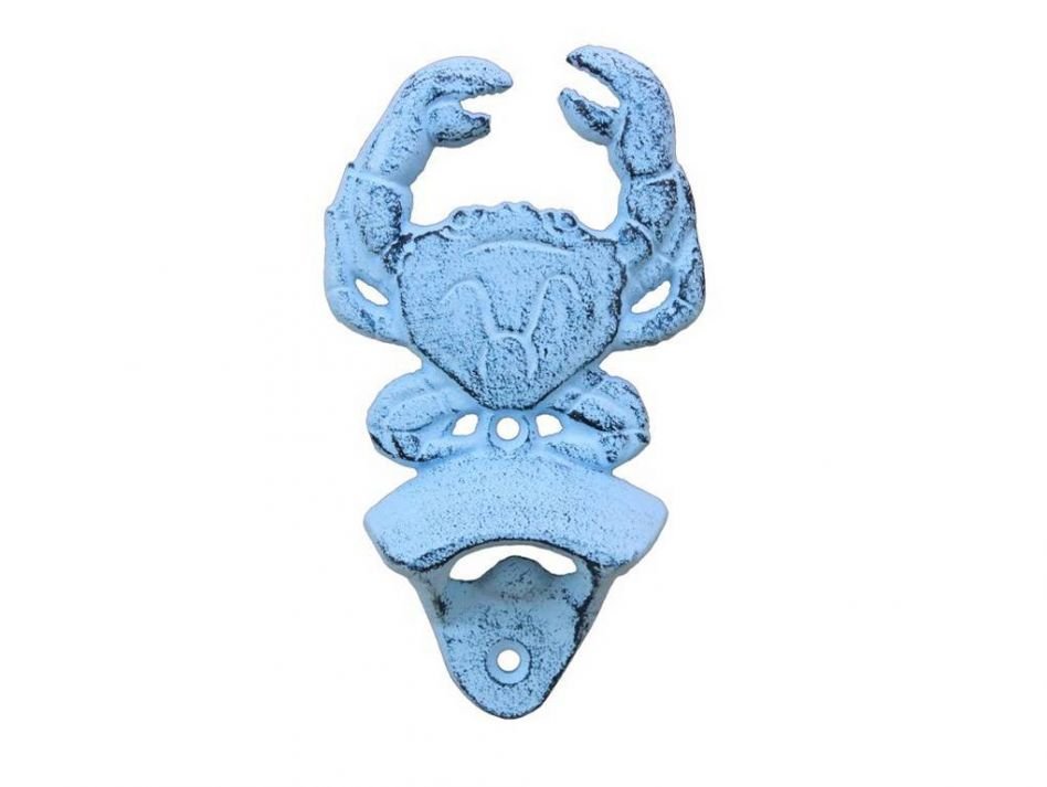 The Cast Iron Wall Mounted Crab Bottle Opener 6" perfectly accents any nautical themed kitchen or bar. Crafted from cast iron rustic finish, this heavy bottle opener will open even the most difficult of bottles with ease.