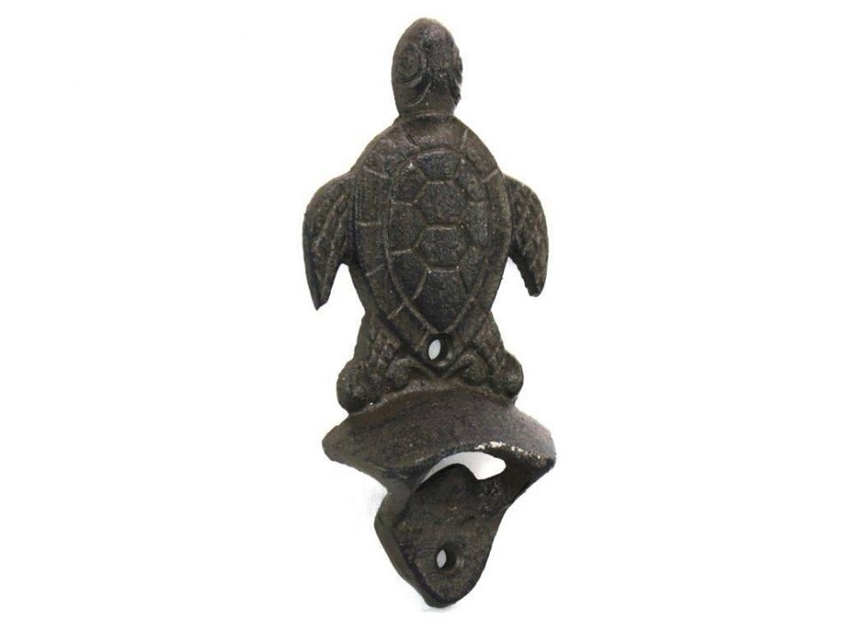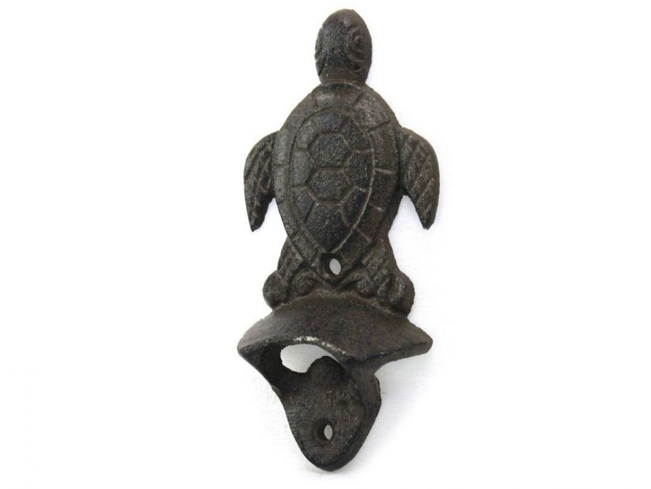 The Antique Bronze Cast Iron Wall Mounted Sea Turtle Bottle Opener 6" perfectly accents any nautical themed kitchen or bar. Crafted from cast iron rustic finish, this heavy bottle opener will open even the most difficult of bottles with ease.