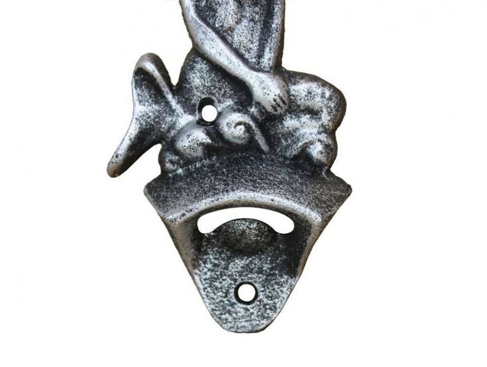 The Cast Iron Wall Mounted Mermaid Bottle Opener 6" perfectly accents any nautical themed kitchen or bar. Crafted from cast iron rustic finish, this heavy bottle opener will open even the most difficult of bottles with ease.