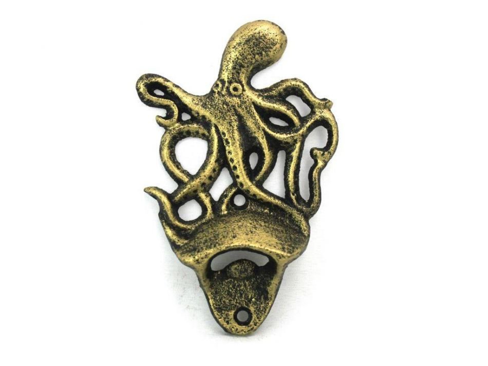 The Antique Bronze Cast Iron Wall Mounted Octopus Bottle Opener 6" perfectly accents any nautical themed kitchen or bar. Crafted from cast iron rustic finish, this heavy bottle opener will open even the most difficult of bottles with ease.