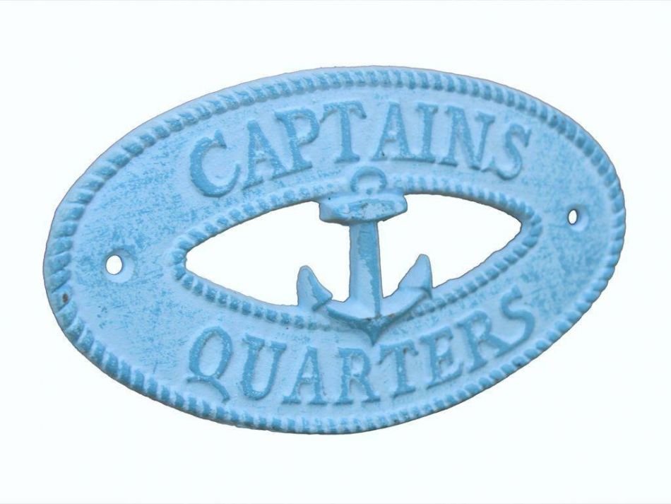 Ideal for posting in any nautical themed room, this brilliant "Dark Blue Whitewashed Cast Iron Captains Quarters with Anchor Sign 8" clearly gets its point across. With a textured, rustic framing and body, this distinctive nautical metal wall art plaque is easily mountable. Display this nautical decor sign on your boat or in your nautical home and show your affinity for the sea-faring lifestyle to those who visit.