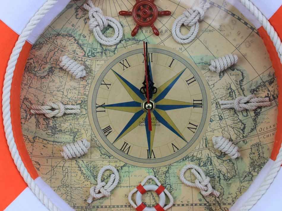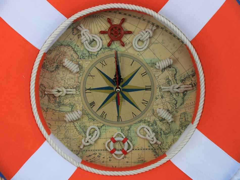 A decorative plethora of functionality and grace, the Vibrant Orange Decorative Lifering Clock With White Bands 18" is classy and functional all while creating the perfect nautical mood in your home, office, or pool house. A Nautical star is displayed in the middle of the clock with roman numeric characters at the end of each star point for an elegant touch. Sailors knots mark individual hours, and the real map background supplies a strong feel of being on a real ship.