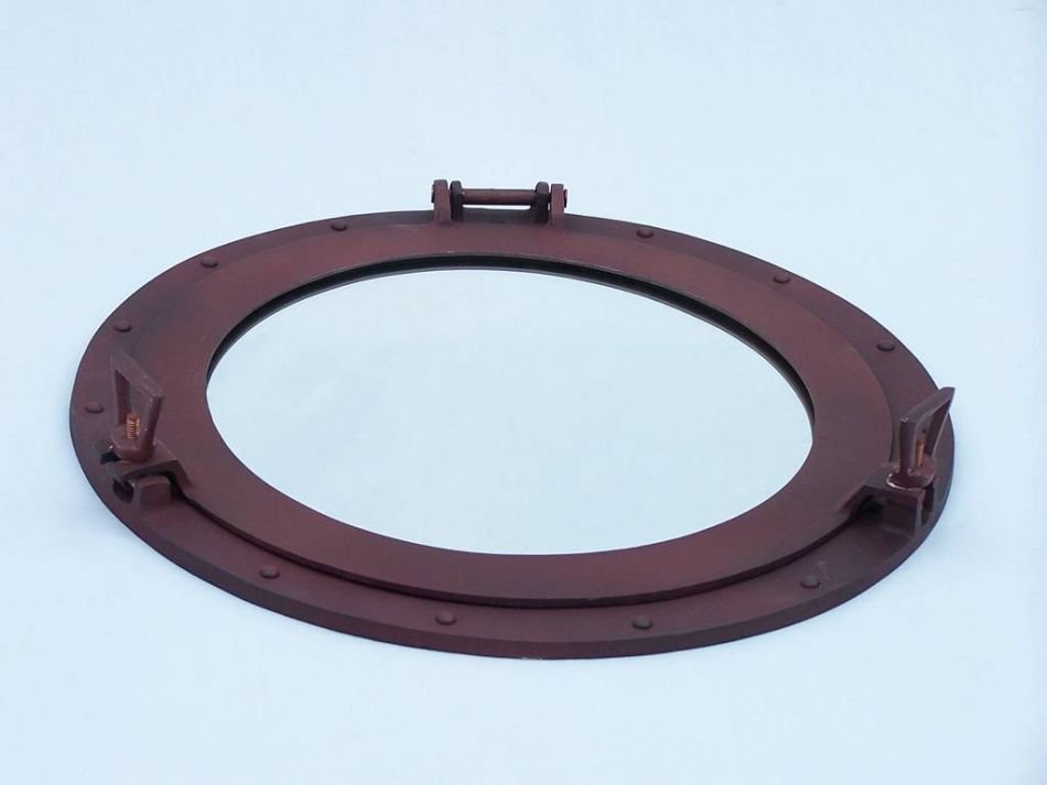 This Antique Copper Deluxe Class Porthole Mirror 17" adds sophistication, style, and charm for those looking to enhance rooms with a nautical theme. This antique porthole mirror has a sturdy, heavy and authentic appearance, and is made of rustic antique copper and glass which can easily be hung to grace any nautical theme wall. This all antique copper porthole mirror makes a fabulous style statement in any room with its classic round frame, metal-like rivets and two dog ears.