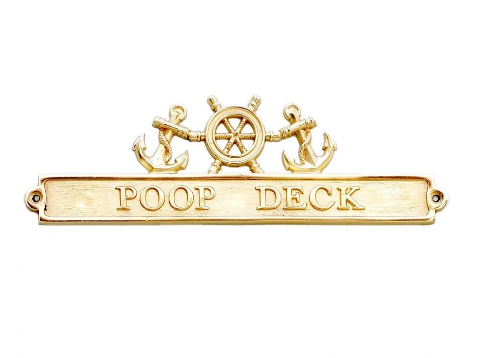 Ideal for posting in any nautical themed room, this brilliant "Brass Poop Deck Sign with Ship Wheel and Anchors 12" clearly gets its point across. With a textured, brass framing and body, this distinctive nautical wall art plaque is easily mountable. Display this nautical decor sign on your boat or in your nautical home and show your affinity for the sea-faring lifestyle to those who visit.
