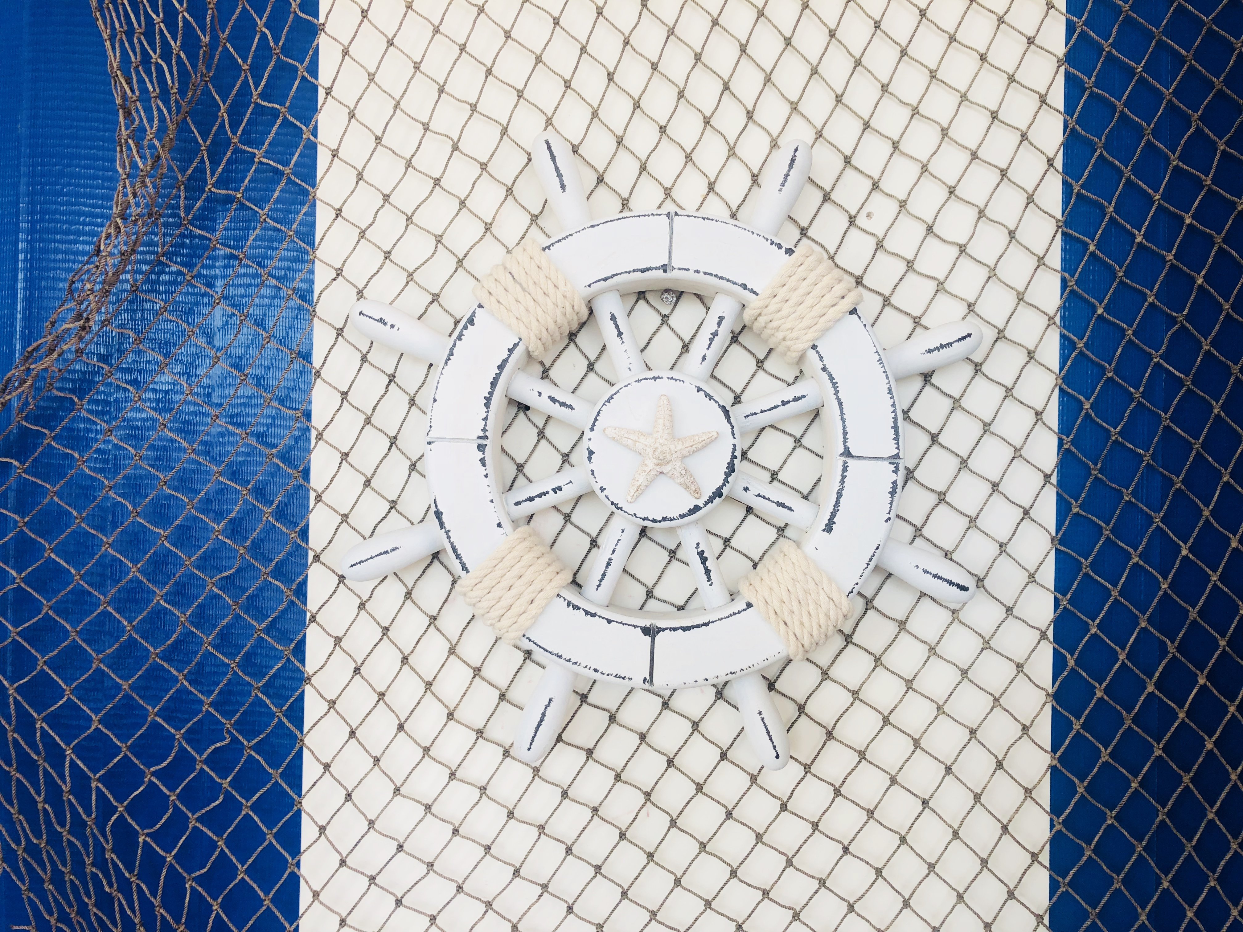 This Dark Blue Ship Wheel with Starfish 12" combines a bold finish with a starfish decoration to make this the perfect nautical wall hanging to accent your home. Ideal for those who love starfish decor and nautical wall art, this beach decor will leave your guests in awe. This steering wheel has eight spokes surrounding it and is easily mountable to a wall in need of a beach decoration.