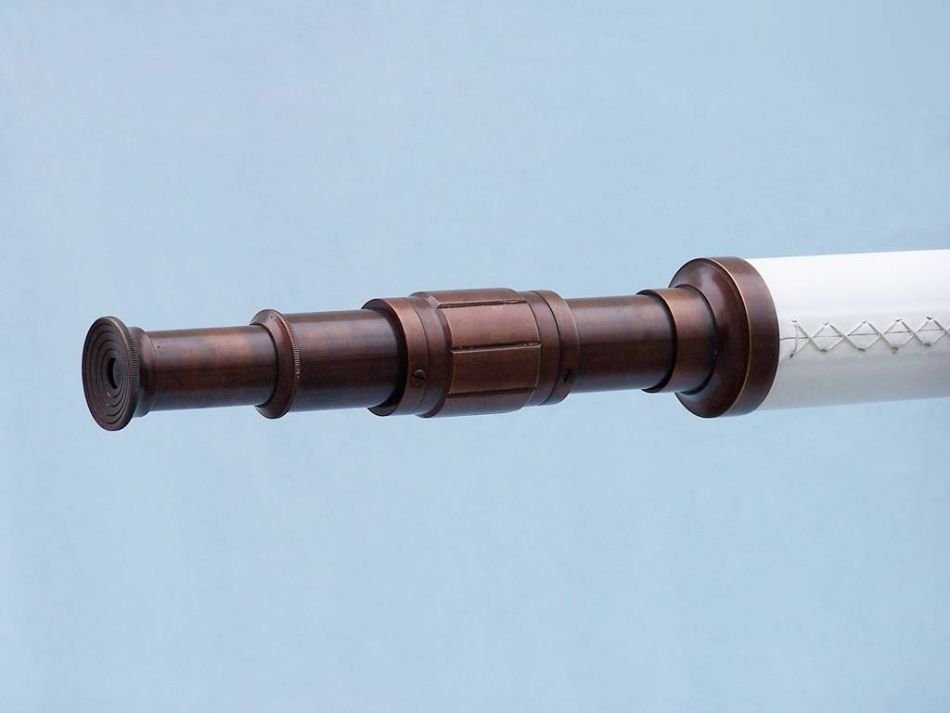 The Hampton Nautical Brushed Nickel/ White Leather Galileo Telescope 65" is by far our standout choice amongst nautical enthusiasts worldwide. Constructed from brushed nickel and leather, this refractor telescope is mounted on a white wooden tripod. This telescope is a fully functioning nautical masterpiece that adds class and sophistication to any room it’s in. This is a perfect gift for the nautical explorer, an appropriate piece to spruce up an office for the busy executive, or perfectly position this exquisite telescope by your window sill to stargaze. The main scope is brushed nickel wrapped in white leather, which shines beautifully when placed in the sunlight. Focusing is accomplished by adjusting the eyepiece ring on the telescope tube, with up to 15x magnification. A removable brushed nickel cap, connected by a chain, protects the objective lens.