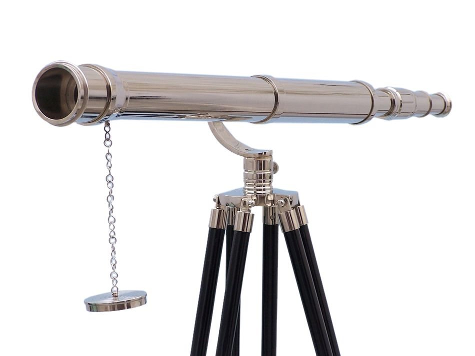 The Hampton Nautical Brushed Nickel/ White Leather Galileo Telescope 65" is by far our standout choice amongst nautical enthusiasts worldwide. Constructed from brushed nickel and leather, this refractor telescope is mounted on a white wooden tripod. This telescope is a fully functioning nautical masterpiece that adds class and sophistication to any room it’s in. This is a perfect gift for the nautical explorer, an appropriate piece to spruce up an office for the busy executive, or perfectly position this exquisite telescope by your window sill to stargaze. The main scope is brushed nickel wrapped in white leather, which shines beautifully when placed in the sunlight. Focusing is accomplished by adjusting the eyepiece ring on the telescope tube, with up to 15x magnification. A removable brushed nickel cap, connected by a chain, protects the objective lens.