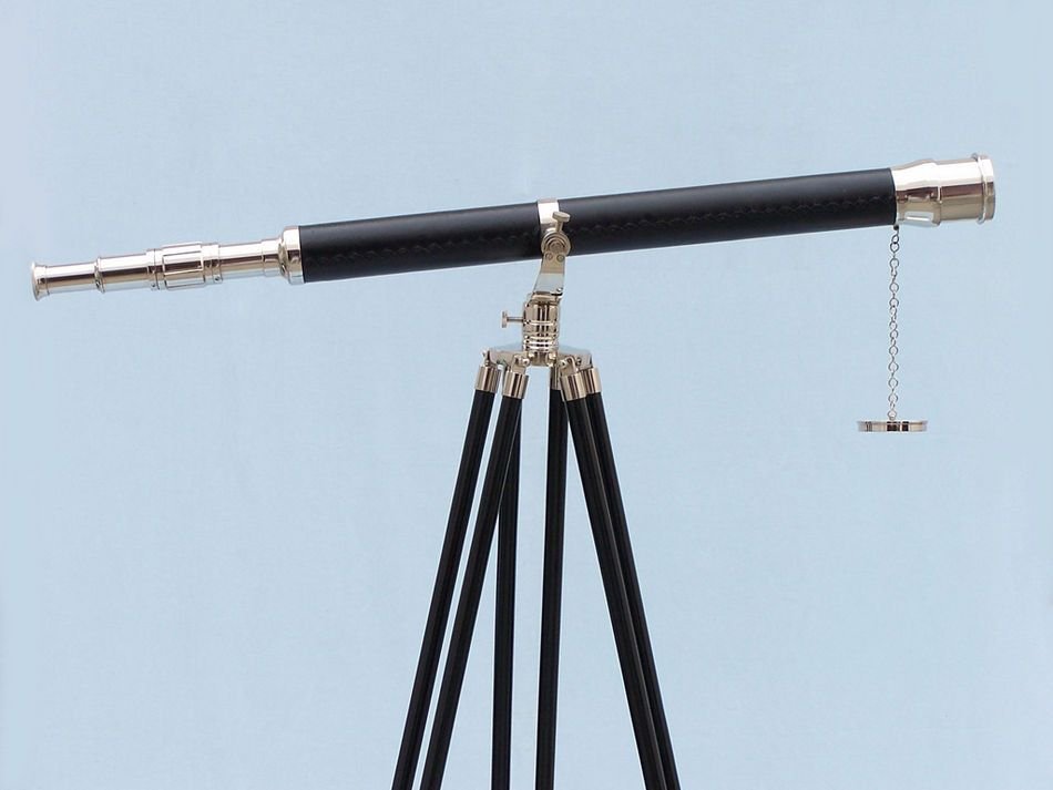 The Hampton Nautical Brushed Nickel/ White Leather Galileo Telescope 65" is by far our standout choice amongst nautical enthusiasts worldwide. Constructed from brushed nickel and leather, this refractor telescope is mounted on a white wooden tripod. This telescope is a fully functioning nautical masterpiece that adds class and sophistication to any room it’s in. This is a perfect gift for the nautical explorer, an appropriate piece to spruce up an office for the busy executive, or perfectly position this exquisite telescope by your window sill to stargaze. The main scope is brushed nickel wrapped in white leather, which shines beautifully when placed in the sunlight. Focusing is accomplished by adjusting the eyepiece ring on the telescope tube, with up to 15x magnification. A removable brushed nickel cap, connected by a chain, protects the objective lens.