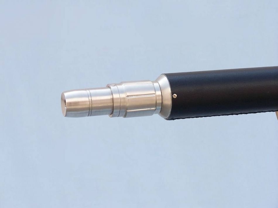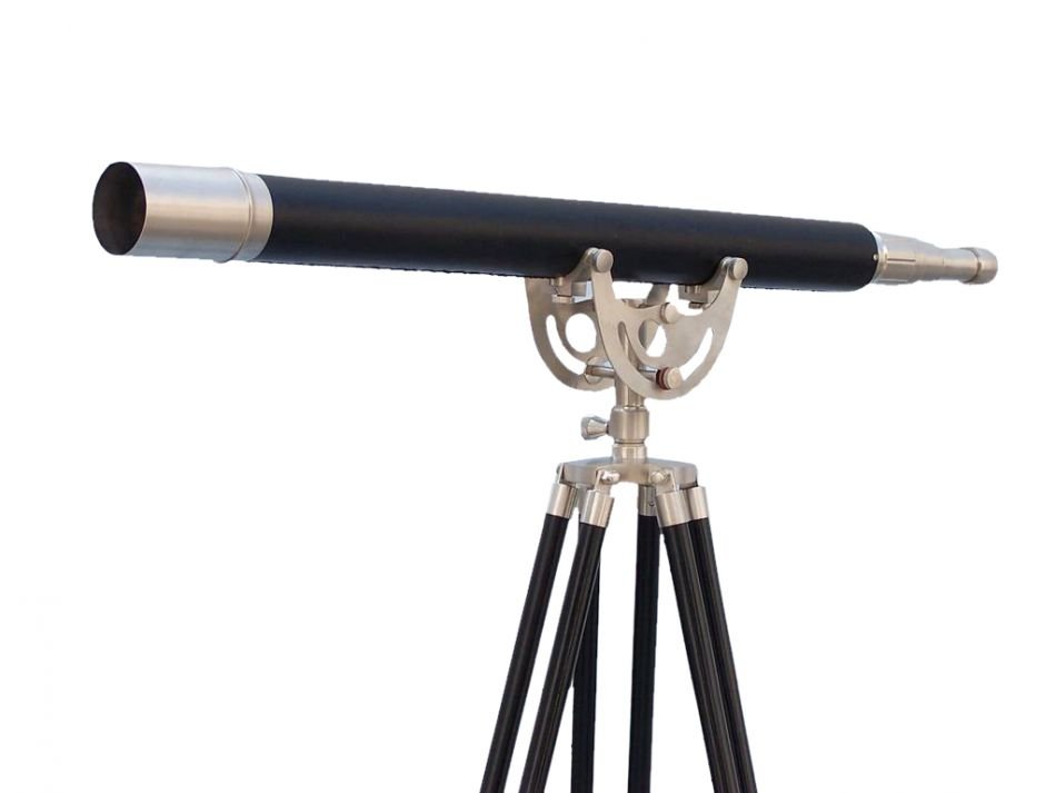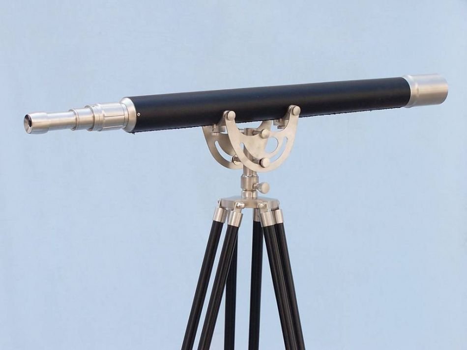 The Floor Standing Brushed Nickel/White Leather Anchormaster Telescope 65" is a beautiful, brushed nickel and leather, refractor telescope mounted on a wooden tripod. This white leather telescope is a fully functioning nautical masterpiece that adds class and sophistication to any room it’s in. This is a perfect nautical gift for the explorer in your life. The main scope is brushed nickel wrapped in white leather, which shines beautifully when placed in the sunlight. Focusing is accomplished by adjusting the eyepiece ring on the telescope tube, with up to 18x magnification.
