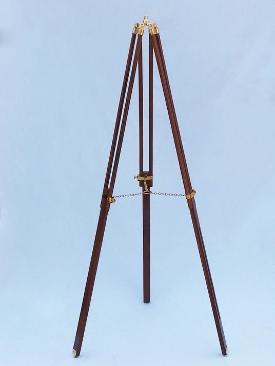 The white wooden tripod stand features smooth, polished round legs, each with solid brass fittings and a screw release to let you adjust the height. A brushed nickel chain holds the three wooden white legs together so the telescope can maintain its position.