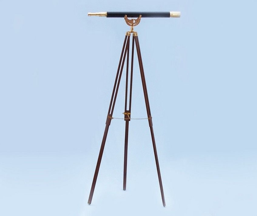 The Floor Standing Brushed Nickel/White Leather Anchormaster Telescope 65" is a beautiful, brushed nickel and leather, refractor telescope mounted on a wooden tripod. This white leather telescope is a fully functioning nautical masterpiece that adds class and sophistication to any room it’s in. This is a perfect nautical gift for the explorer in your life. The main scope is brushed nickel wrapped in white leather, which shines beautifully when placed in the sunlight. Focusing is accomplished by adjusting the eyepiece ring on the telescope tube, with up to 18x magnification.