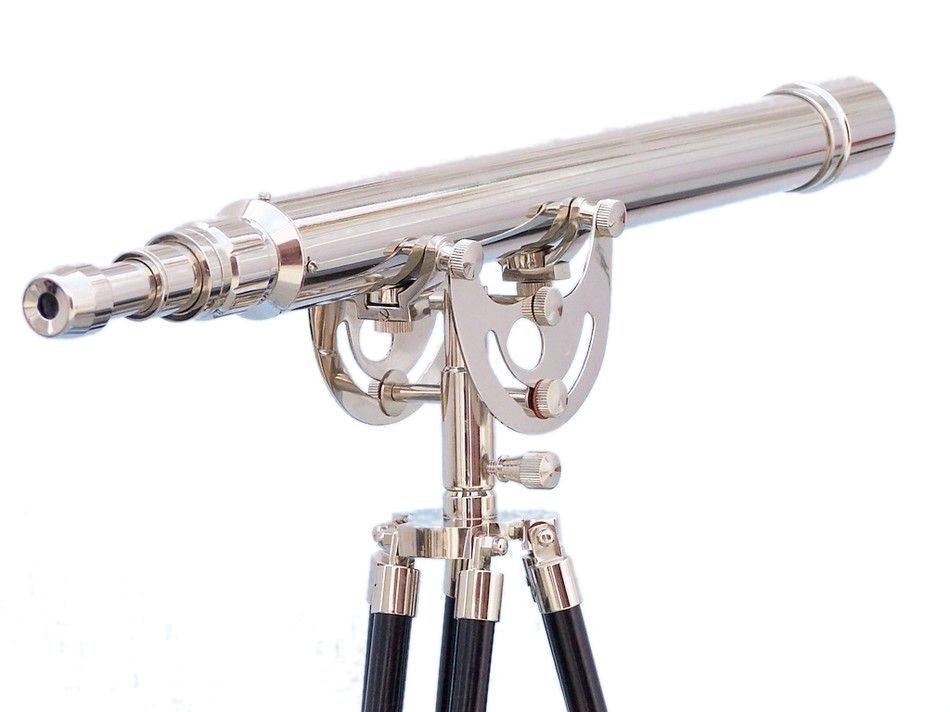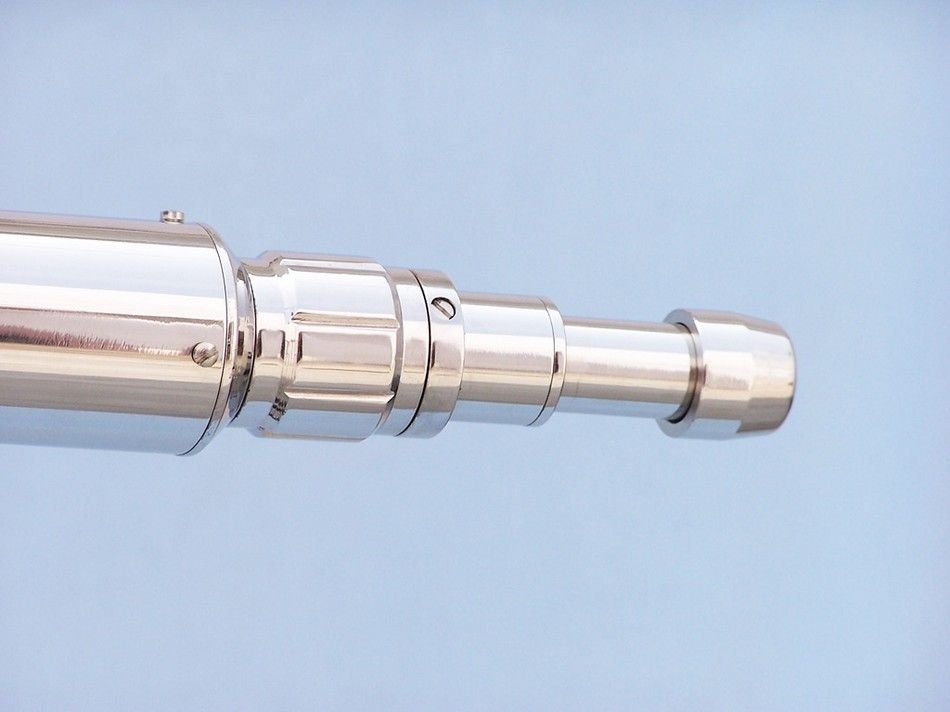 The Floor Standing Brushed Nickel/White Leather Anchormaster Telescope 65" is a beautiful, brushed nickel and leather, refractor telescope mounted on a wooden tripod. This white leather telescope is a fully functioning nautical masterpiece that adds class and sophistication to any room it’s in. This is a perfect nautical gift for the explorer in your life. The main scope is brushed nickel wrapped in white leather, which shines beautifully when placed in the sunlight. Focusing is accomplished by adjusting the eyepiece ring on the telescope tube, with up to 18x magnification.