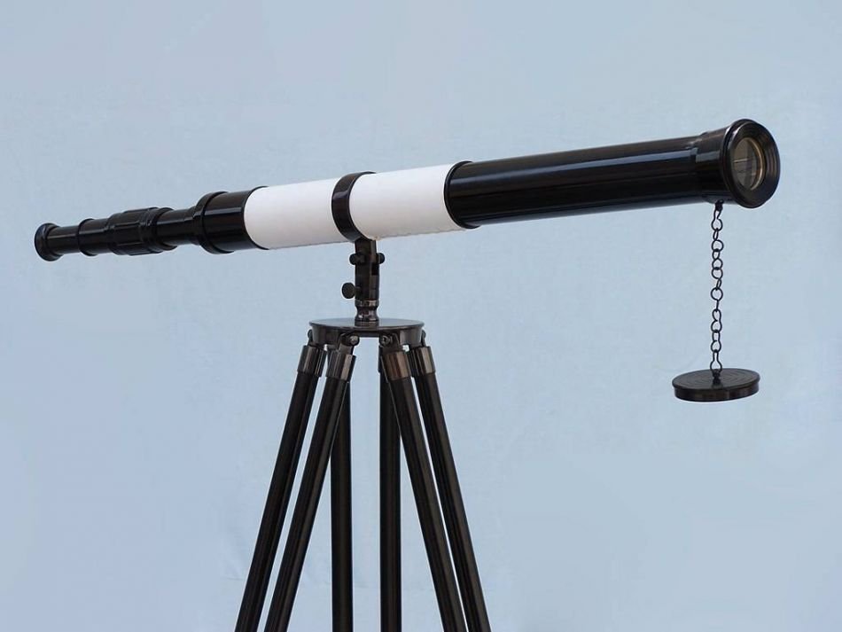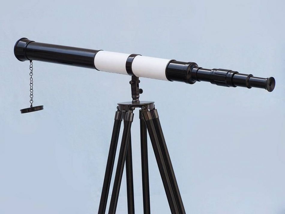 This Hampton Nautical Admiral's Floor Standing Chrome with Leather Telescope 60" is a beautiful, 100% chrome, refractor telescope mounted on a wooden tripod. The perfect gift for the nautical explorer, this telescope is a fully functioning nautical masterpiece that adds class and sophistication to any room. The main scope is polished chrome wrapped in leather, which shines beautifully when placed in the sunlight. Focusing is accomplished by adjusting the eyepiece ring on the telescope tube, with up to 15x magnification. A removable chrome cap, connected by a chain, protects the objective lens.